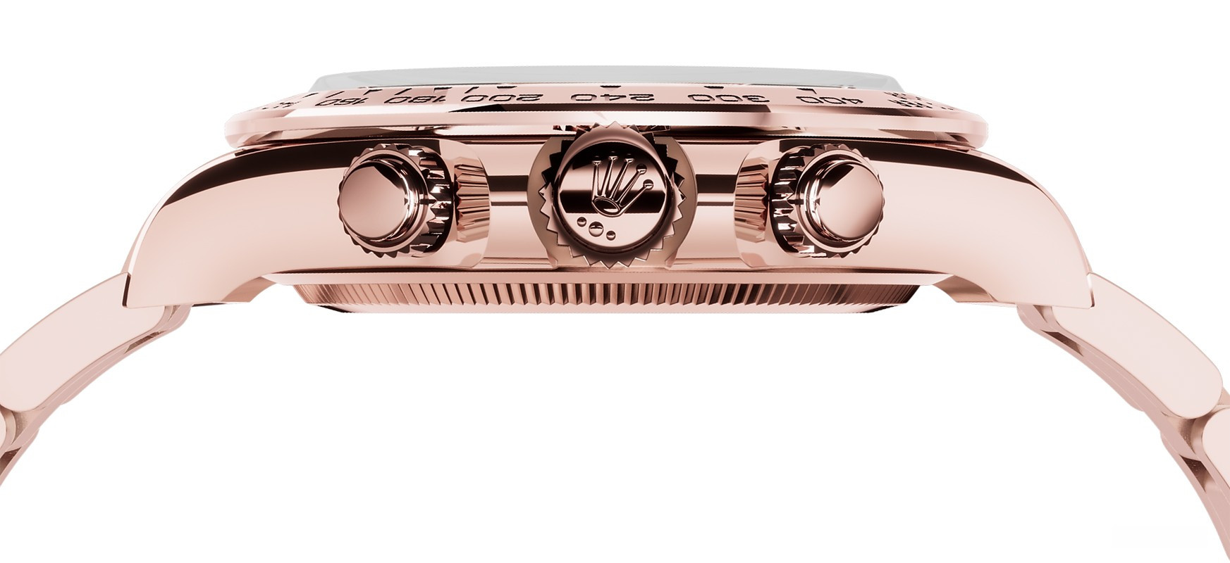 Корпус модели Cosmograph Daytona диаметром 40 мм, гарантирующий водонепроницаемость до 100 метров, является образцом прочности, идеальных пропорций и элегантности. Рифленая задняя крышка плотно привинчена специальным ключом Rolex. Заводная головка, снабженная запатентованной системой тройной герметизации Triplock и защищенная выступами, вырезанными в корпусном кольце, плотно завинчивается на корпусе, также как и кнопки хронографа. Стекло изготовлено из сапфира и устойчиво к появлению царапин. Абсолютно непроницаемый корпус Cosmograph Daytona надежно защищает находящийся в нем высокоточный механизм. В модели Cosmograph Daytona установлен Калибр 4131, механизм хронографа с вертикальным расположением шестеренок и автоматическим подзаводом, полностью разработанный и изготовленный Ролексом. Как и все механизмы Perpetual производства Rolex, Калибр 4131 имеет сертификат швейцарского Хронометра, выдаваемый сверхточным часам, успешно прошедшим тестирование в Официальном швейцарском институте хронометрии (COSC). Его концепция и качество изготовления придают этой модели несравненную точность и надежность. Осциллятор – подлинное сердце часов – оснащен синей спиралью баланса Parachrom, запатентованной Ролексом и изготовленной из особого сплава ниобия и циркония. Абсолютно невосприимчивая к магнитным полям, эта спираль может противостоять термическим воздействиям и сохранять точность при ударах в десять раз лучше, чем обычная спираль. Часы комплектуются браслетом из розового золота 18к.