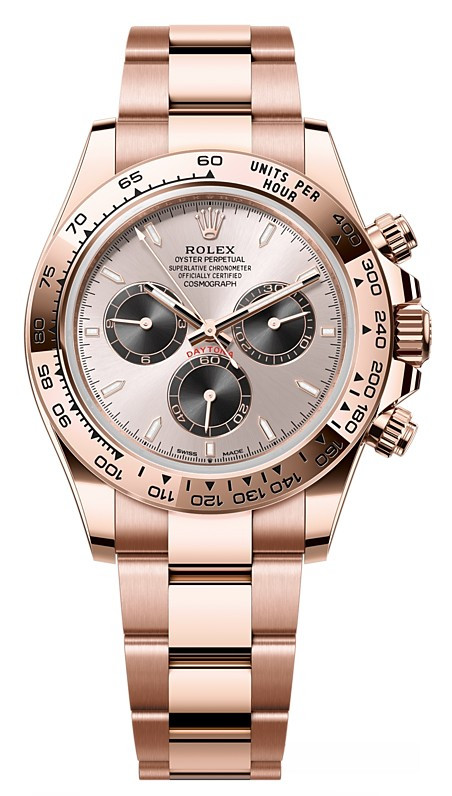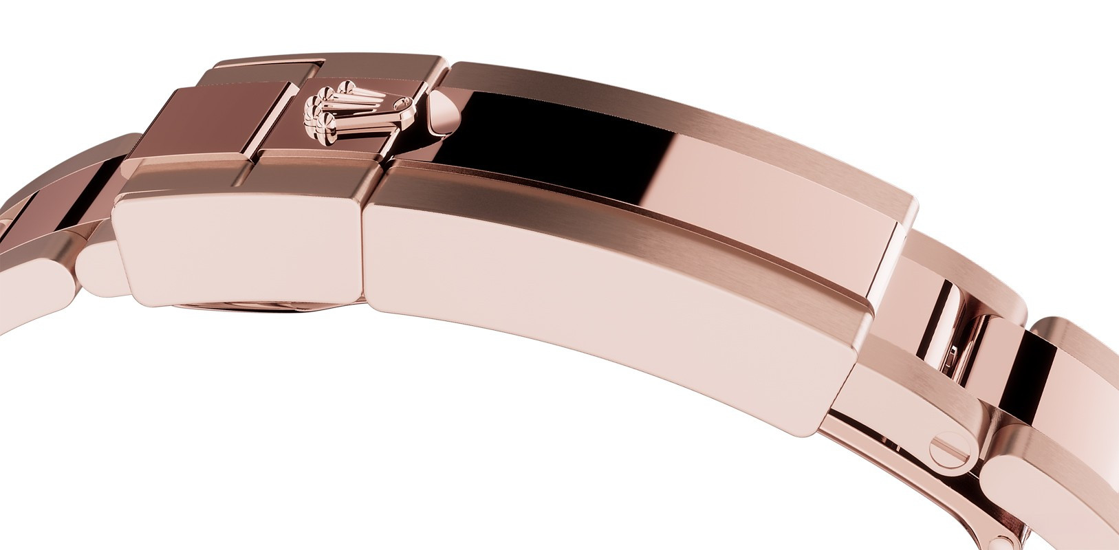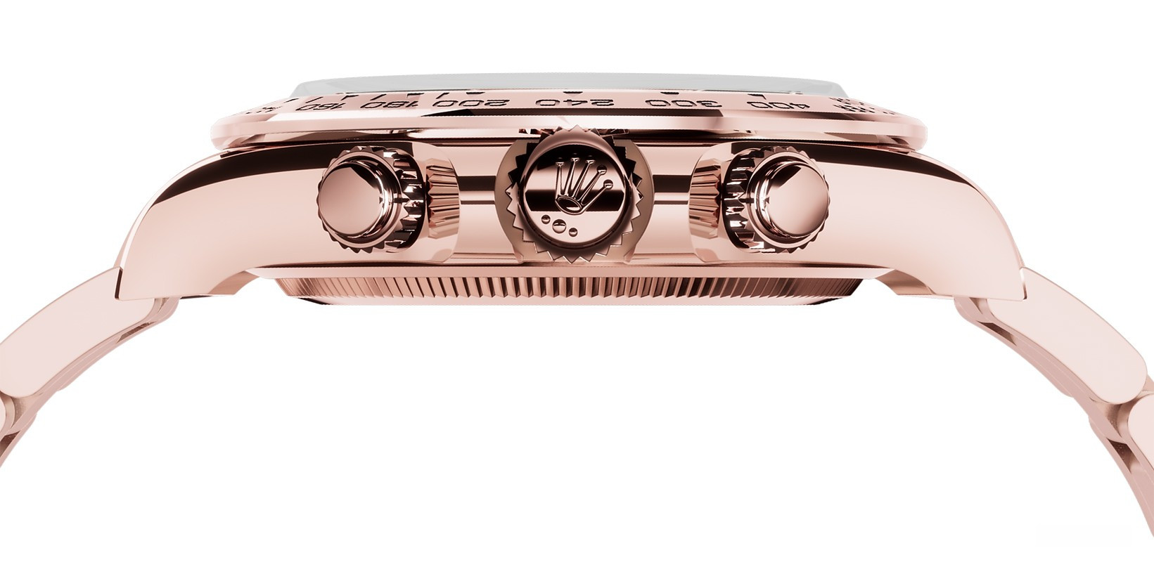 Корпус модели Cosmograph Daytona диаметром 40 мм, гарантирующий водонепроницаемость до 100 метров, является образцом прочности, идеальных пропорций и элегантности. Рифленая задняя крышка плотно привинчена специальным ключом Rolex. Заводная головка, снабженная запатентованной системой тройной герметизации Triplock и защищенная выступами, вырезанными в корпусном кольце, плотно завинчивается на корпусе, также как и кнопки хронографа. Стекло изготовлено из сапфира и устойчиво к появлению царапин. Абсолютно непроницаемый корпус Cosmograph Daytona надежно защищает находящийся в нем высокоточный механизм. В модели Cosmograph Daytona установлен Калибр 4131, механизм хронографа с вертикальным расположением шестеренок и автоматическим подзаводом, полностью разработанный и изготовленный Ролексом. Как и все механизмы Perpetual производства Rolex, Калибр 4131 имеет сертификат швейцарского Хронометра, выдаваемый сверхточным часам, успешно прошедшим тестирование в Официальном швейцарском институте хронометрии (COSC). Его концепция и качество изготовления придают этой модели несравненную точность и надежность. Осциллятор – подлинное сердце часов – оснащен синей спиралью баланса Parachrom, запатентованной Ролексом и изготовленной из особого сплава ниобия и циркония. Абсолютно невосприимчивая к магнитным полям, эта спираль может противостоять термическим воздействиям и сохранять точность при ударах в десять раз лучше, чем обычная спираль. Часы комплектуются браслетом из розового золота 18к.