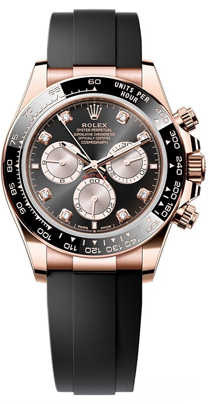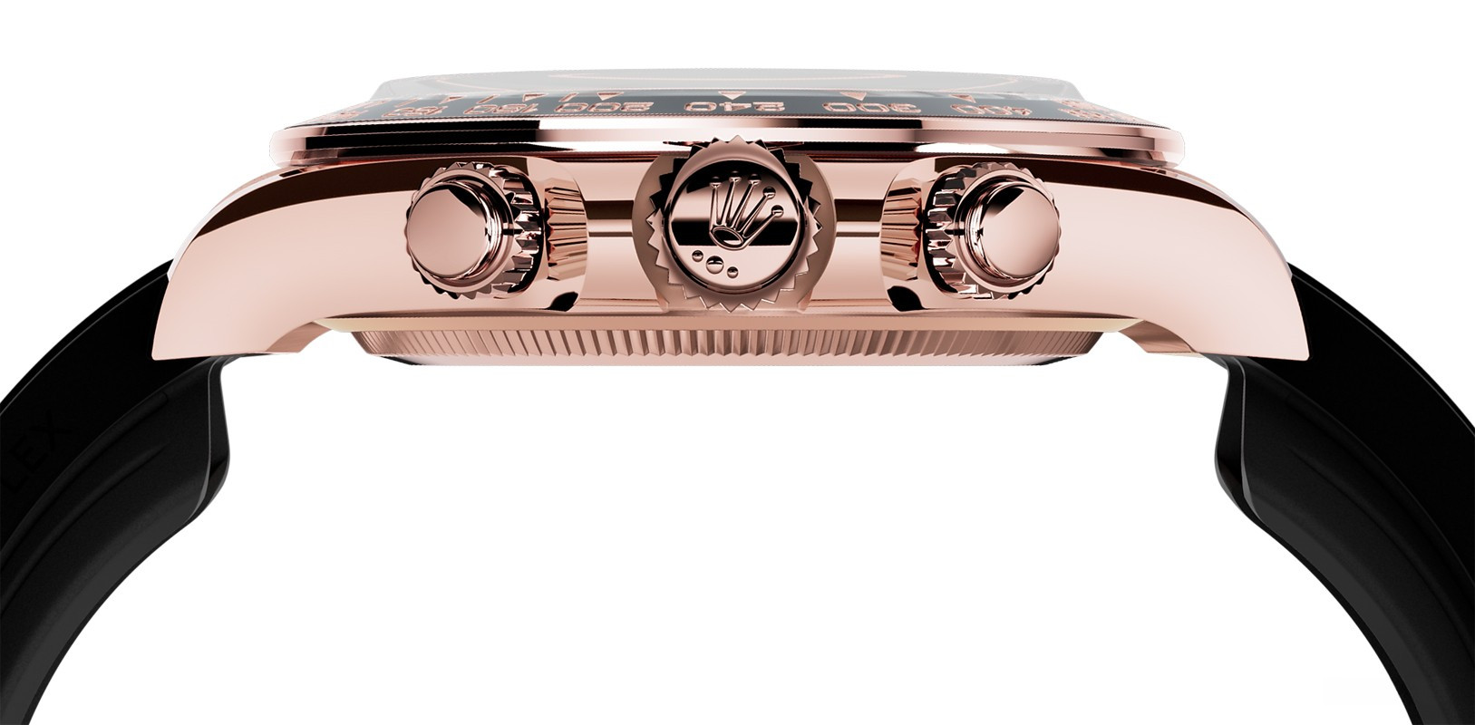 Корпус модели Cosmograph Daytona диаметром 40 мм, гарантирующий водонепроницаемость до 100 метров, является образцом прочности, идеальных пропорций и элегантности. Рифленая задняя крышка плотно привинчена специальным ключом Rolex. Заводная головка, снабженная запатентованной системой тройной герметизации Triplock и защищенная выступами, вырезанными в корпусном кольце, плотно завинчивается на корпусе, также как и кнопки хронографа. Стекло изготовлено из сапфира и устойчиво к появлению царапин. Абсолютно непроницаемый корпус Cosmograph Daytona надежно защищает находящийся в нем высокоточный механизм. В модели Cosmograph Daytona установлен Калибр 4131, механизм хронографа с вертикальным расположением шестеренок и автоматическим подзаводом, полностью разработанный и изготовленный Ролексом. Как и все механизмы Perpetual производства Rolex, Калибр 4131 имеет сертификат швейцарского Хронометра, выдаваемый сверхточным часам, успешно прошедшим тестирование в Официальном швейцарском институте хронометрии (COSC). Его концепция и качество изготовления придают этой модели несравненную точность и надежность. Осциллятор – подлинное сердце часов – оснащен синей спиралью баланса Parachrom, запатентованной Ролексом и изготовленной из особого сплава ниобия и циркония. Абсолютно невосприимчивая к магнитным полям, эта спираль может противостоять термическим воздействиям и сохранять точность при ударах в десять раз лучше, чем обычная спираль. Часы комплектуются каучуковым ремешком с золотой застежкой.