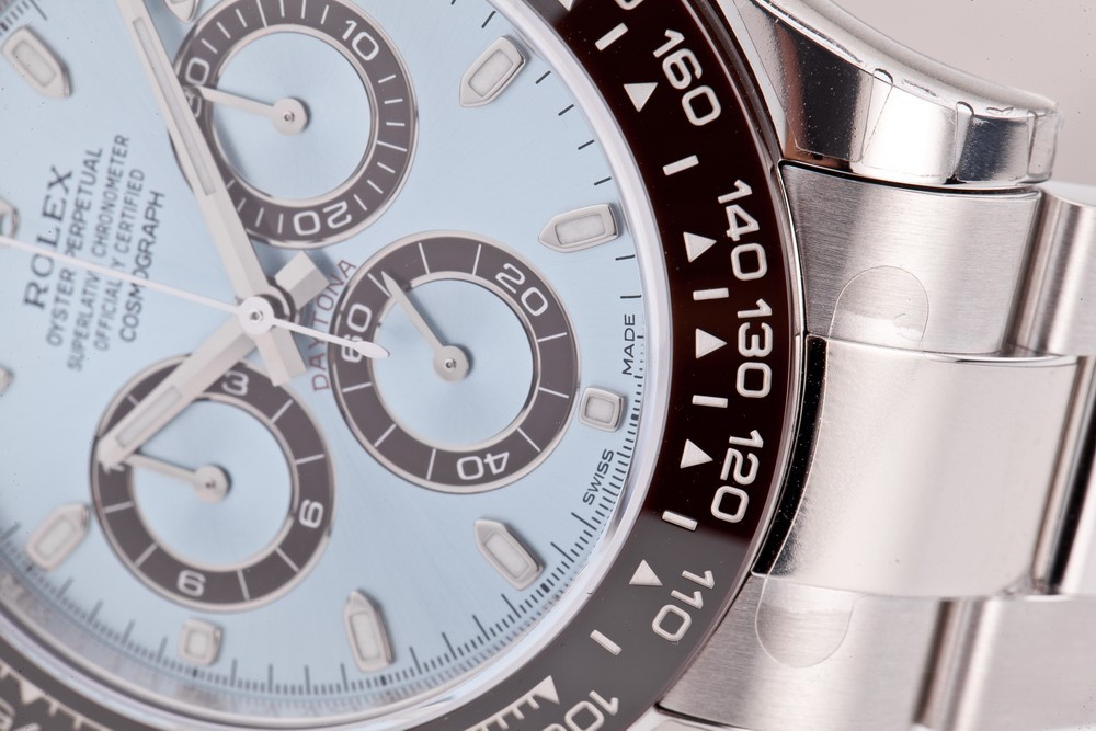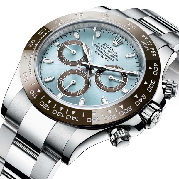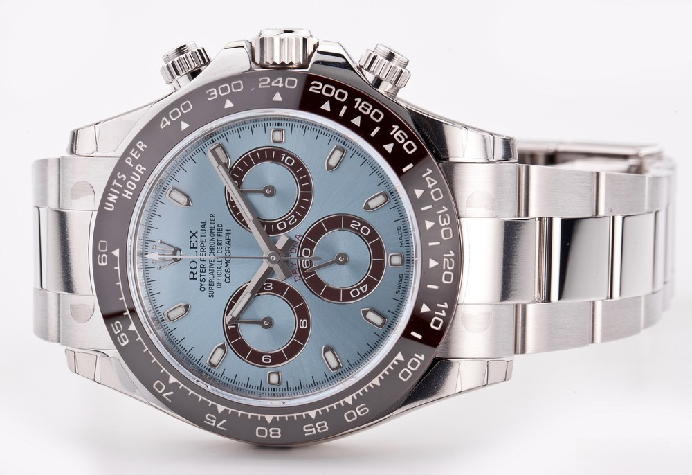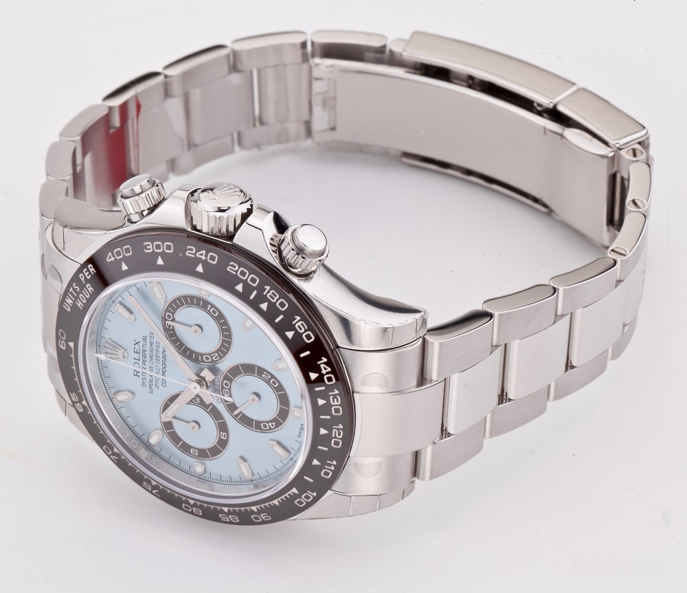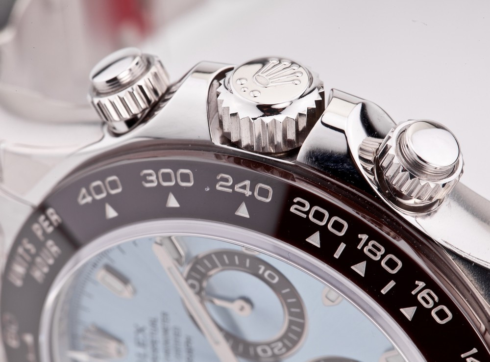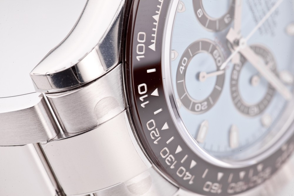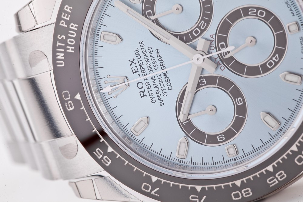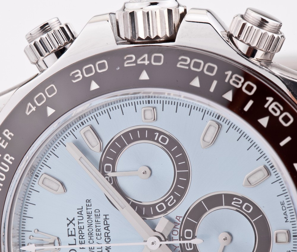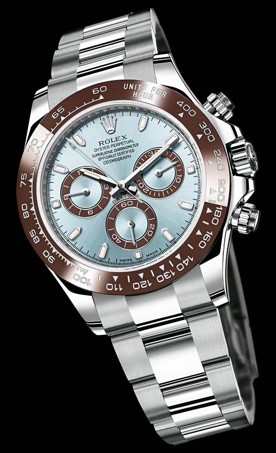 Корпус модели, как это и явствует из ее названия, изготовлен из платины, его диаметр составляет 40 мм, водонепроницаемость - 100 метров. Безель из коричневой керамики Cerachrom с тахиметрической шкалой, выполненной из платины. На торце защищенной завинчивающейся заводной головки выгравирована корона - эмблема бренда Rolex. Сапфировое стекло защищает циферблат светло-голубого цвета с накладными часовыми идексами, выполненнными, как и стрелки, из белого золота. Индексы, часовая и минутная стрелки имеют люминесцентное покрытие белого цвета. Модель оснащена мануфактурным швейцарским автоматическим механизмом Rolex 4130, с колонным колесом хронографа, на 44 камнях, с балансовой частотой 28800 полуколебаний в час (4 гц), 72-часовым запасом хода, функциями индикации часов, минут (посредством соответствующих центральных стрелок), секунд (на малом боковом циферблате, расположенном на 6 часах), а также с хронографом (центральная секундная стрелка, 30-минутный счетчик, расположенный на 3 часах и 12-часовый счетчик, расположенный на 9 часах). Калибр официально сертифицирован COSC (Contrôle Officiel Suisse des Chronomètres) в качестве хронометра. Поставляется на платиновом браслете с раскладной застежкой Oysterlock с настройками Easylink.
