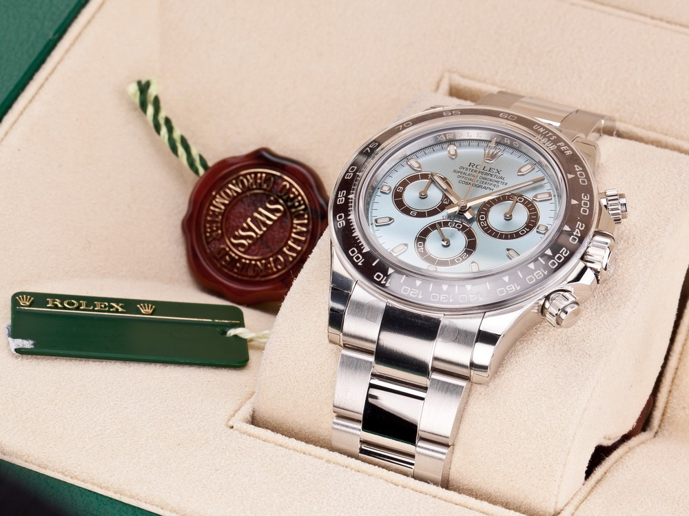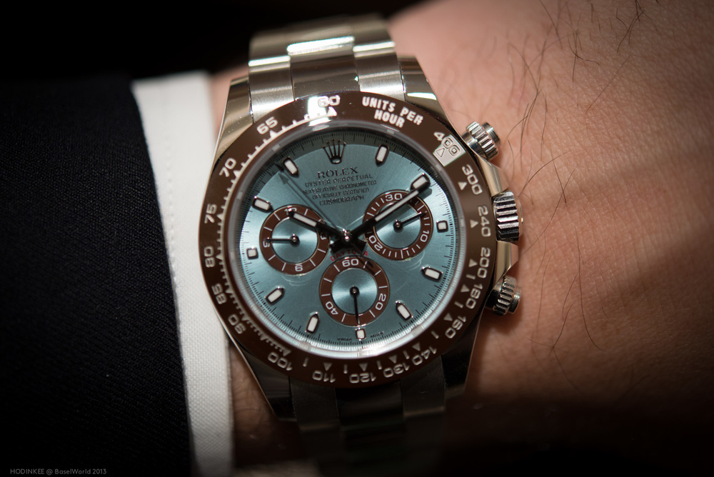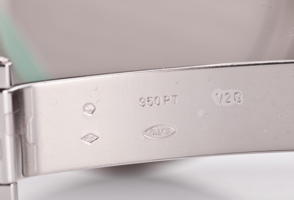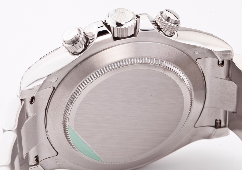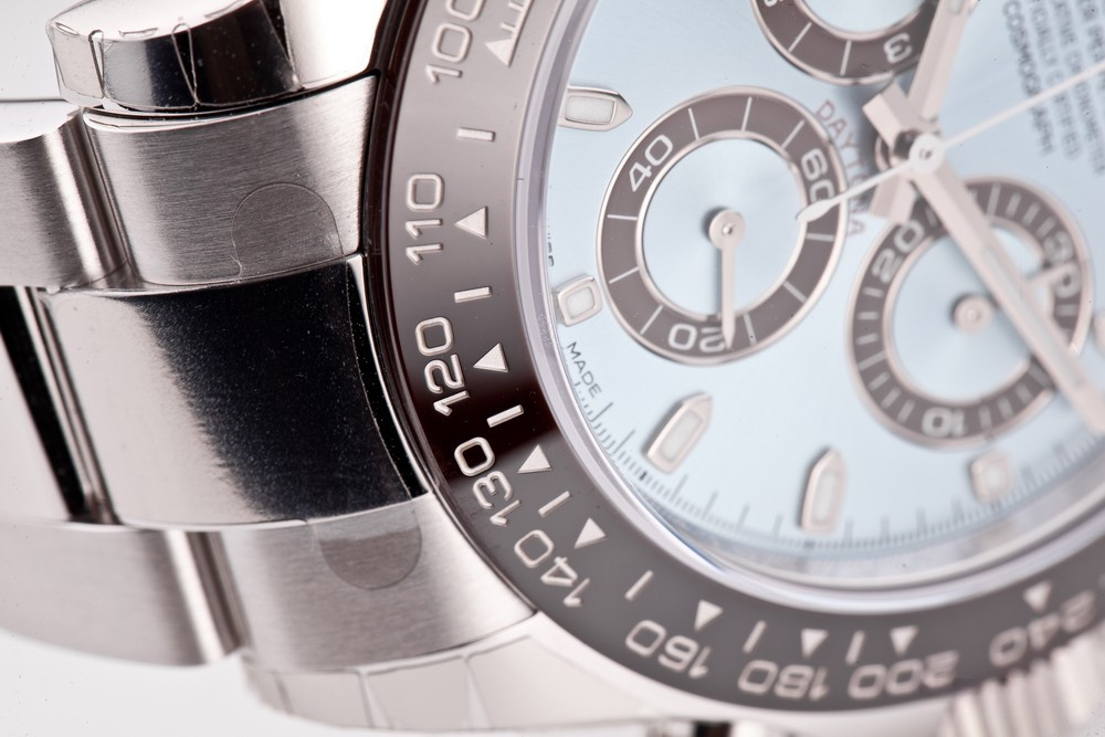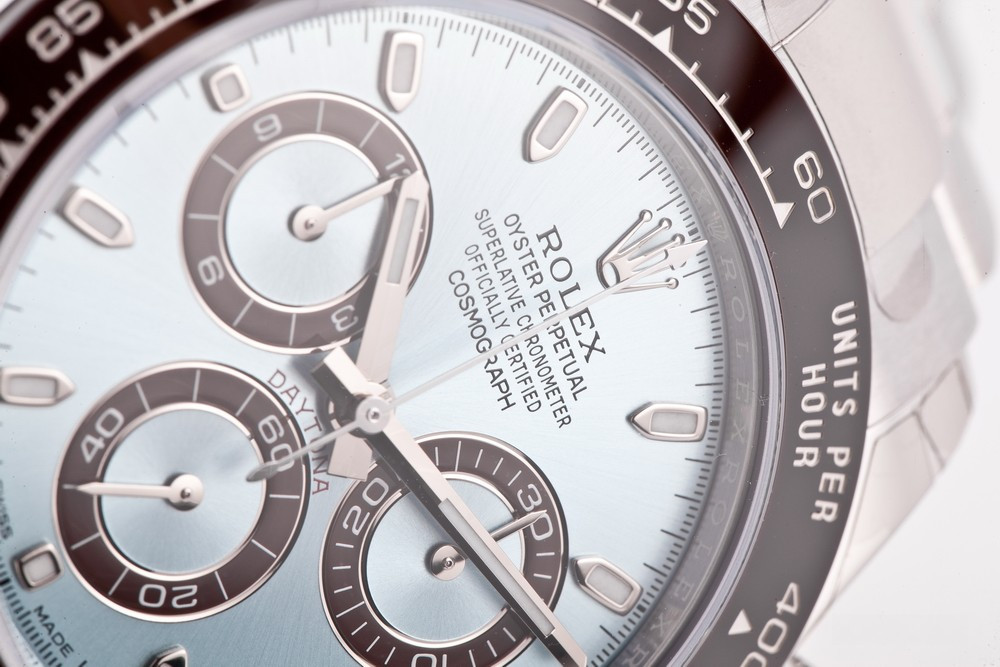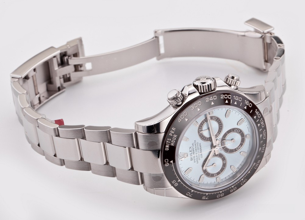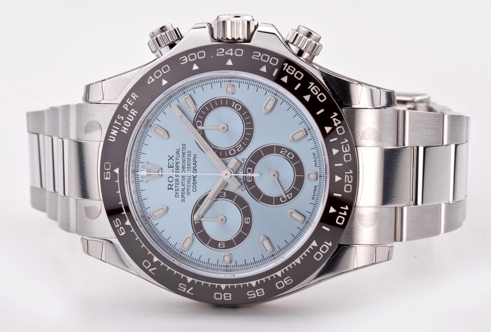 Корпус модели, как это и явствует из ее названия, изготовлен из платины, его диаметр составляет 40 мм, водонепроницаемость - 100 метров. Безель из коричневой керамики Cerachrom с тахиметрической шкалой, выполненной из платины. На торце защищенной завинчивающейся заводной головки выгравирована корона - эмблема бренда Rolex. Сапфировое стекло защищает циферблат светло-голубого цвета с накладными часовыми идексами, выполненнными, как и стрелки, из белого золота. Индексы, часовая и минутная стрелки имеют люминесцентное покрытие белого цвета. Модель оснащена мануфактурным швейцарским автоматическим механизмом Rolex 4130, с колонным колесом хронографа, на 44 камнях, с балансовой частотой 28800 полуколебаний в час (4 гц), 72-часовым запасом хода, функциями индикации часов, минут (посредством соответствующих центральных стрелок), секунд (на малом боковом циферблате, расположенном на 6 часах), а также с хронографом (центральная секундная стрелка, 30-минутный счетчик, расположенный на 3 часах и 12-часовый счетчик, расположенный на 9 часах). Калибр официально сертифицирован COSC (Contrôle Officiel Suisse des Chronomètres) в качестве хронометра. Поставляется на платиновом браслете с раскладной застежкой Oysterlock с настройками Easylink.