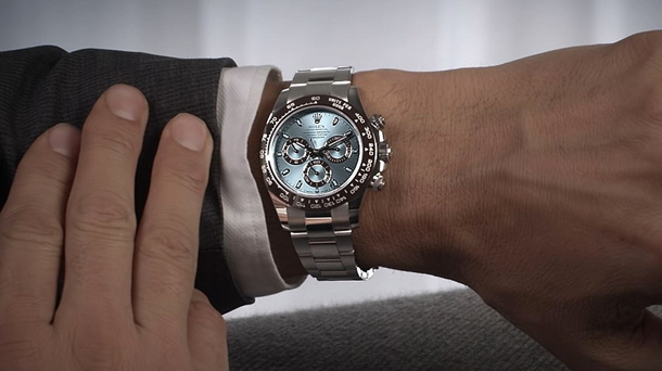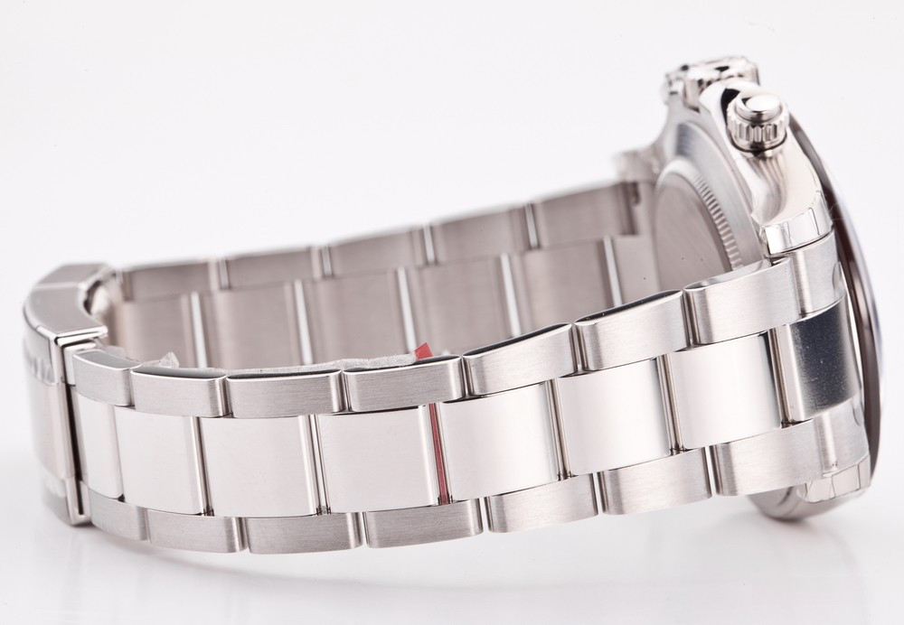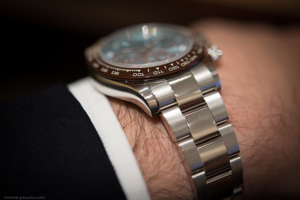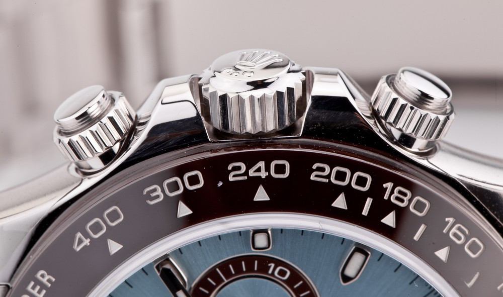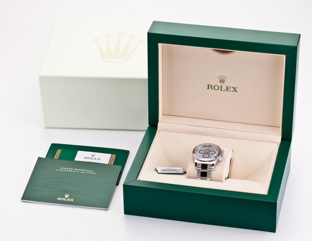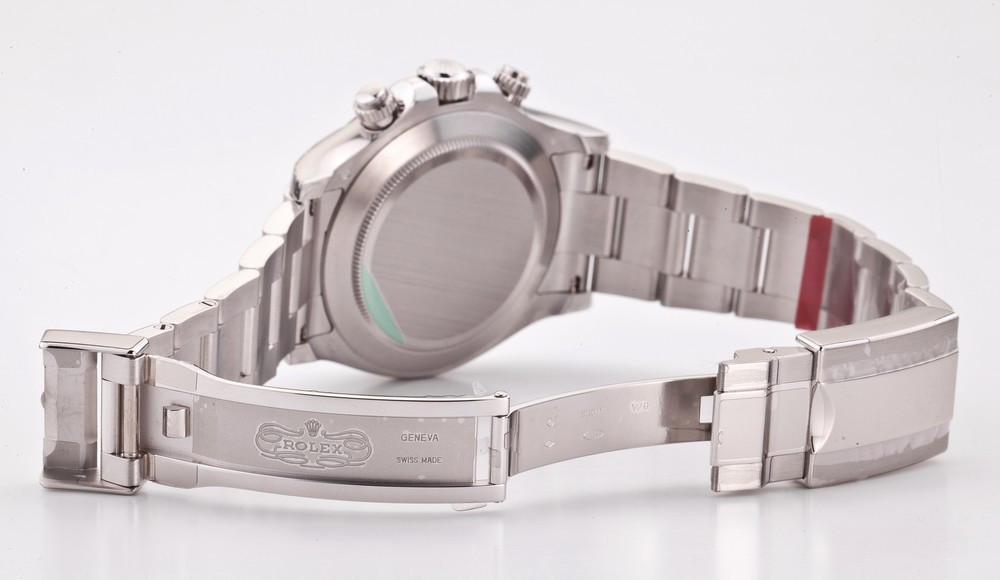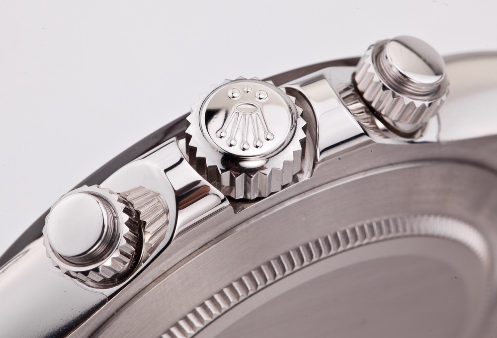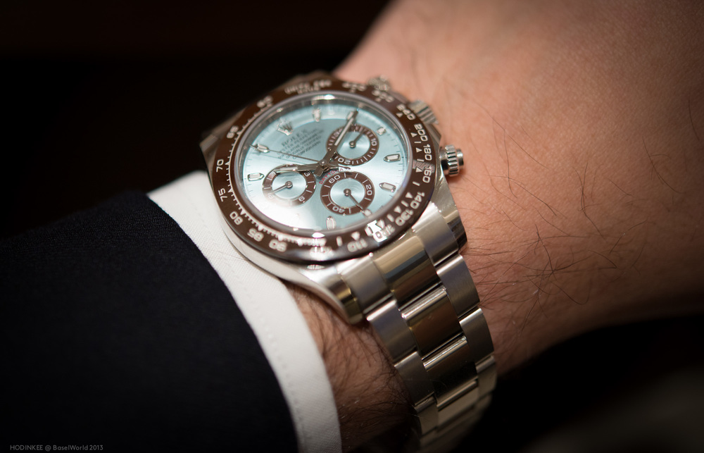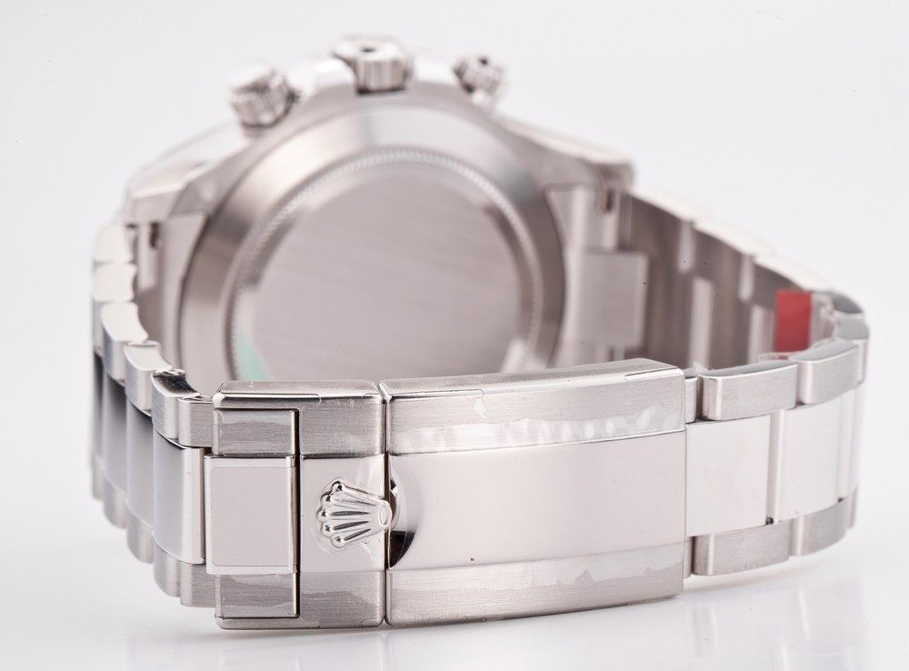 Корпус модели, как это и явствует из ее названия, изготовлен из платины, его диаметр составляет 40 мм, водонепроницаемость - 100 метров. Безель из коричневой керамики Cerachrom с тахиметрической шкалой, выполненной из платины. На торце защищенной завинчивающейся заводной головки выгравирована корона - эмблема бренда Rolex. Сапфировое стекло защищает циферблат светло-голубого цвета с накладными часовыми идексами, выполненнными, как и стрелки, из белого золота. Индексы, часовая и минутная стрелки имеют люминесцентное покрытие белого цвета. Модель оснащена мануфактурным швейцарским автоматическим механизмом Rolex 4130, с колонным колесом хронографа, на 44 камнях, с балансовой частотой 28800 полуколебаний в час (4 гц), 72-часовым запасом хода, функциями индикации часов, минут (посредством соответствующих центральных стрелок), секунд (на малом боковом циферблате, расположенном на 6 часах), а также с хронографом (центральная секундная стрелка, 30-минутный счетчик, расположенный на 3 часах и 12-часовый счетчик, расположенный на 9 часах). Калибр официально сертифицирован COSC (Contrôle Officiel Suisse des Chronomètres) в качестве хронометра. Поставляется на платиновом браслете с раскладной застежкой Oysterlock с настройками Easylink.