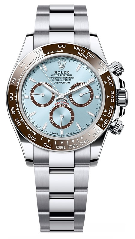 Часы Rolex Daytona представлены в корпусе размером 40 мм из платины 950 с керамическим безелем водонепроницаемостью 100 метров. Внутри корпуса установлен автоматический механизм, Калибр 4131, обладающий запасом хода 42 часа. На голубом циферблате отображаются часы, минуты, секунды. Часы поставляются на браслете из платины 950.