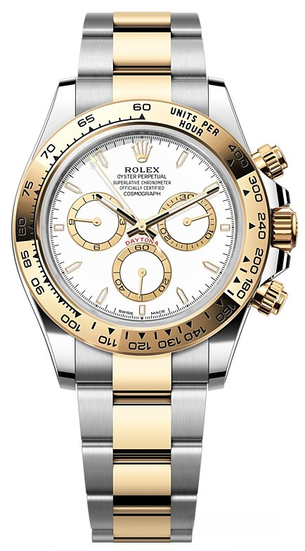 Водостойкие часы Rolex Daytona Cosmograph Daytona 40mm Steel and Yellow Gold с хронографом (являются официально сертифицированным хронометром COSC) выпущены в круглом корпусе из желтого золота 18к и нержавеющей стали. Размер составляет 40 мм, водонепроницаемость 100 м. Внутри корпуса установлен автоматический механизм, Калибр 4131, обеспечивающий запас хода 72 часа. На белом циферблате отображаются часы, минуты, секунды, тахиметр. Часы комплектуются браслетом из желтого золота 18к и нержавеющей стали.