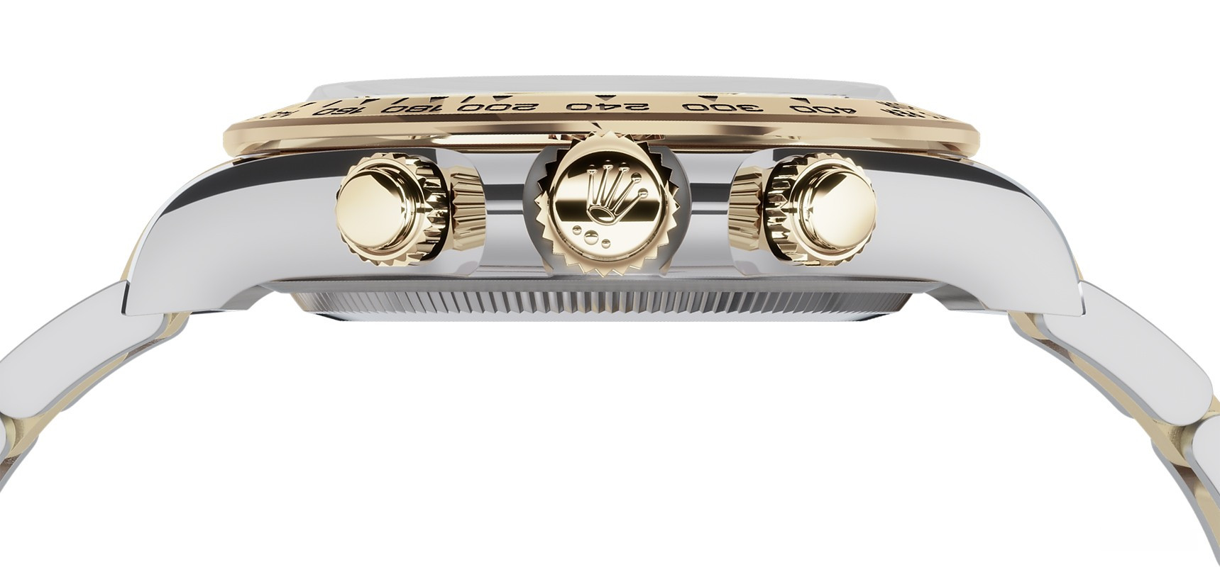 Водостойкие часы Rolex Daytona Cosmograph Daytona 40mm Steel and Yellow Gold с хронографом (являются официально сертифицированным хронометром COSC) выпущены в круглом корпусе из желтого золота 18к и нержавеющей стали. Размер составляет 40 мм, водонепроницаемость 100 м. Внутри корпуса установлен автоматический механизм, Калибр 4131, обеспечивающий запас хода 72 часа. На черном циферблате с 8-ю белыми бриллиантами отображаются часы, минуты, секунды, тахиметр. Часы комплектуются браслетом из желтого золота 18к и нержавеющей стали.