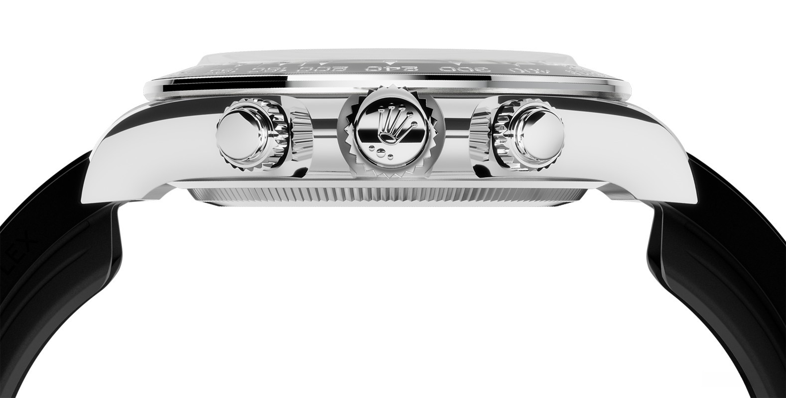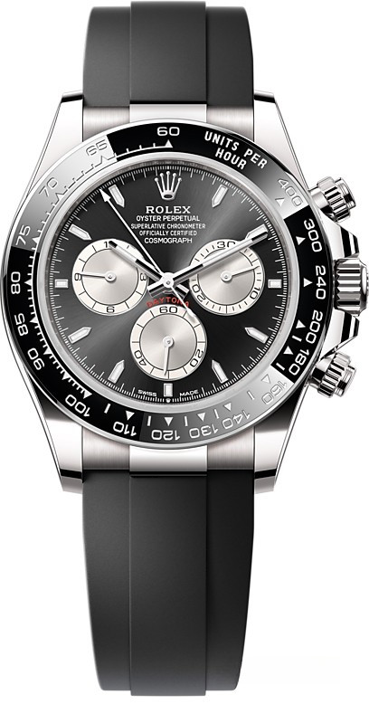 Новая модель Cosmograph Daytona, сочетающая высокие технологии и благородную эстетику, продолжает традиции легендарного хронографа. Безель с гравированной тахиметрической шкалой – ключевой элемент этой модели – позволяет измерять скорость в пределах до 400 миль или километров в час. Корпус часов изготовлен из белого золота 18к, циферблат черный с серебристым. Часы комплектуются каучуковым ремешком с золотой застежкой. Для проверки показателей точности хода часов в процессе эксплуатации компания Ролекс тестирует часы в собранном виде, что позволяет гарантировать их исключительные характеристики в ходе ношения в том, что касается точности, водонепроницаемости, автоматического подзавода и запаса хода.