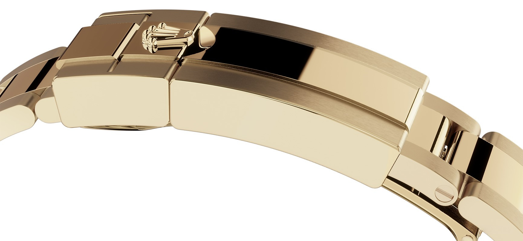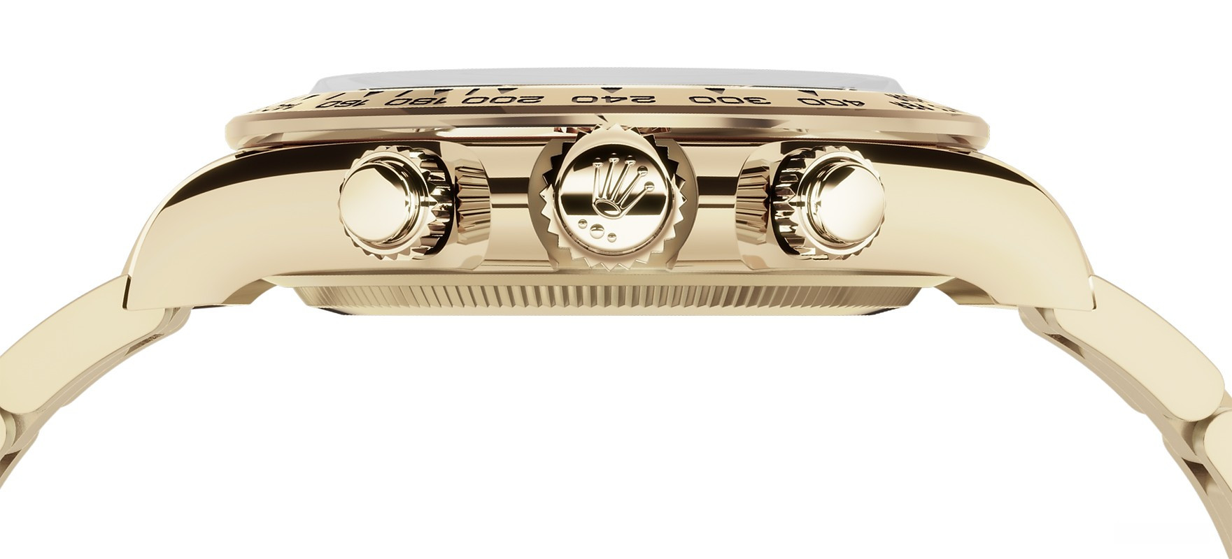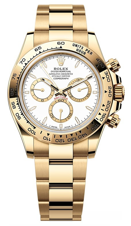Новая модель Cosmograph Daytona, сочетающая высокие технологии и благородную эстетику, продолжает традиции легендарного хронографа. Корпус часов изготовлен из желтого золота 18к, циферблат белый. Часы комплектуются браслетом из желтого золота 18к. Для проверки показателей точности хода часов в процессе эксплуатации компания Ролекс тестирует часы в собранном виде, что позволяет гарантировать их исключительные характеристики в ходе ношения в том, что касается точности, водонепроницаемости, автоматического подзавода и запаса хода. Внутри корпуса установлен автоматический механизм, Калибр 4131, обладающий запасом хода 72 часа.