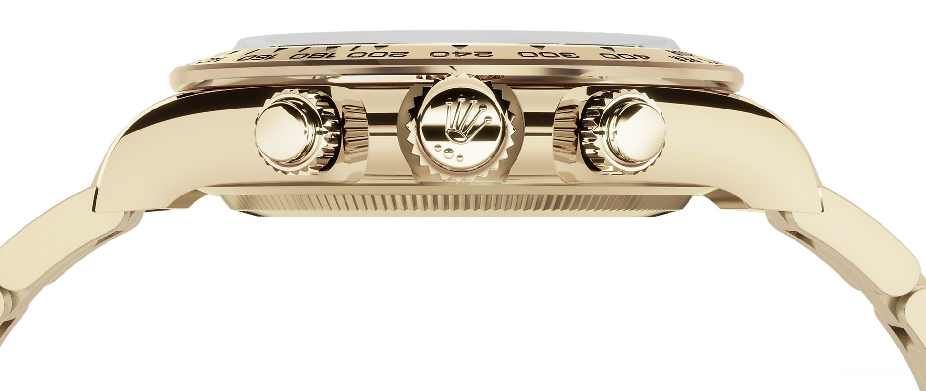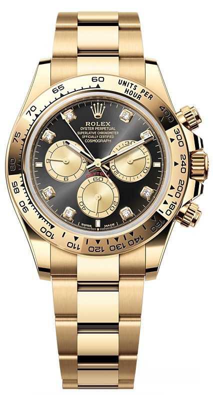 Новая модель Cosmograph Daytona, сочетающая высокие технологии и благородную эстетику, продолжает традиции легендарного хронографа. Корпус часов изготовлен из желтого золота 18к, циферблат черный с золотистым, 8 белых бриллиантов. Часы комплектуются браслетом из желтого золота 18к. Для проверки показателей точности хода часов в процессе эксплуатации компания Ролекс тестирует часы в собранном виде, что позволяет гарантировать их исключительные характеристики в ходе ношения в том, что касается точности, водонепроницаемости, автоматического подзавода и запаса хода. Внутри корпуса установлен автоматический механизм, Калибр 4131, обладающий запасом хода 72 часа.