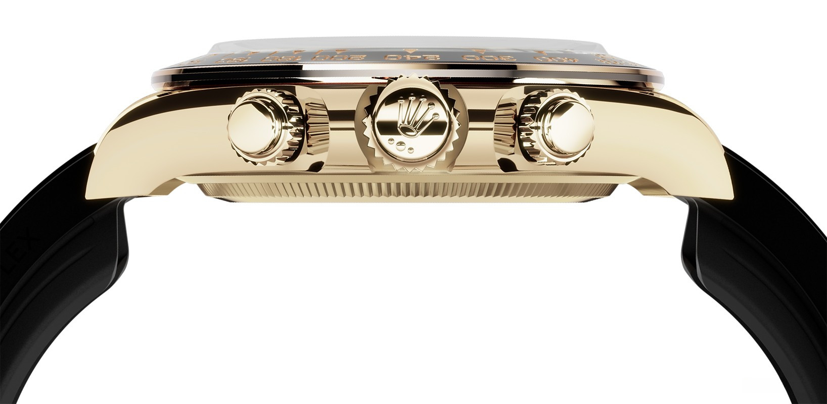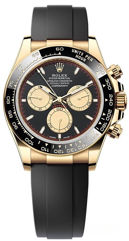 Новая модель Cosmograph Daytona, сочетающая высокие технологии и благородную эстетику, продолжает традиции легендарного хронографа. Корпус часов изготовлен из желтого золота 18к, циферблат черный с золотистым. Часы комплектуются каучуковым ремешком с золотой застежкой. Для проверки показателей точности хода часов в процессе эксплуатации компания Ролекс тестирует часы в собранном виде, что позволяет гарантировать их исключительные характеристики в ходе ношения в том, что касается точности, водонепроницаемости, автоматического подзавода и запаса хода. Внутри корпуса установлен автоматический механизм, Калибр 4131, обладающий запасом хода 72 часа.