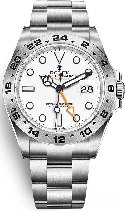 Мужские часы Rolex Explorer II 42mm Steel - идеал часов для исследователя, который не мыслит жизни без открытий. В модели установлен мануфактурный калибр 3285 с автоматическим подзаводом и запасом хода 70 часов. Механизм 3285 оснащен спиралью Parachrom и противоударной системой Paraflex, обеспечивающей более надежную защиту от ударов и сотрясений в экстремальных условиях. Прочный корпус диаметром 42 х 12 мм из стали 904L с крупными цифрами на безеле. Индикация Chromalight свойственна широкими стрелкам, часовой и минутной, а также оранжевой по цвету конусообразной 24-часовой стрелки для индикации второго часового пояса. Индикация Chromalight высокой контрастности на циферблате часов значительно улучшает читаемость показаний в темноте. Ровное голубое свечение часовых отметок и стрелок поддерживается до 8 часов. «Прыгающая» 12-часовая стрелка регулируется при помощи заводной головки, независимо от минутной и секундной стрелок, что обеспечивает точность показаний времени. Уровень водонепроницаемости до 100 метров. Модель дополнена браслетом из нержавеющей стали.