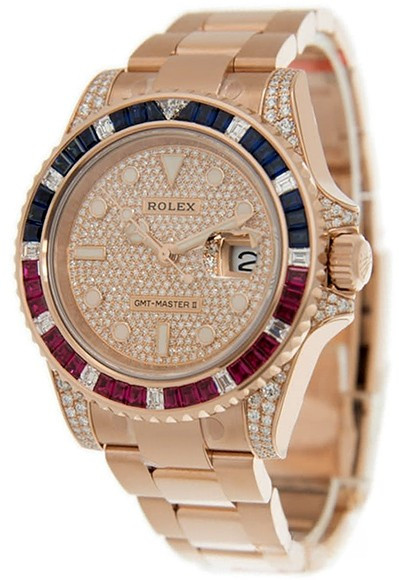 Мужские часы Rolex GMT Master II незаменимы для людей, чья профессиональная деятельность связана с дальними путешествиями. Часы размером 40 х 12,5 мм в корпусе из розового золота 18 карат. Механизм с автоподзаводом, Rolex 3285 с запасом хода 70 часов. Модель оснащена вращающимся безелем с белыми бриллиантами и багетными сапфирами. Время двух часовых поясов показывается одновременно. Центральные часовая, минутная и секундная стрелки. 24-часовая индикация времени. Второй часовой пояс с быстрой и независимой регулировкой часовой стрелки. Быстроустанавливаемая дата. Возможность остановки секундной стрелки для выставления точного времени. Уровень водонепроницаемости до 100 метров. Модель дополнена браслетом Oyster с застежкой Oysterlock и звеньями Easylink.