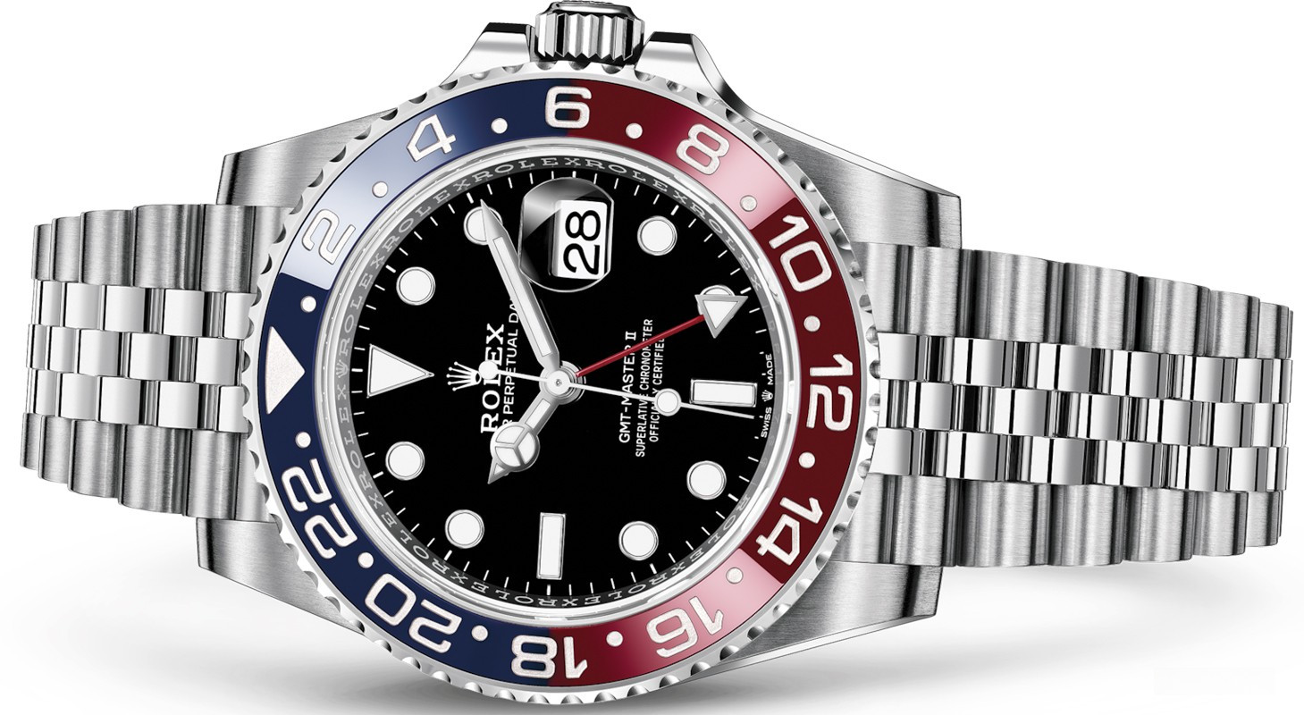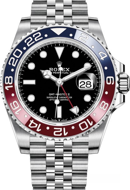 Водостойкие часы Rolex GMT Master II GMT Master II 40mm Steel 126710blro-0001 с двойным временем (являются официально сертифицированным хронометром COSC) выпущены в круглом корпусе из нержавеющей стали. Размер составляет 40 мм, водонепроницаемость 100 м с вращающемся безелем. Внутри корпуса установлен автоматический механизм, Калибр Rolex 3285, обеспечивающий запас хода 70 часов. На черном циферблате отображаются часы, минуты, секунды, дата. Часы комплектуются браслетом из нержавеющей стали.