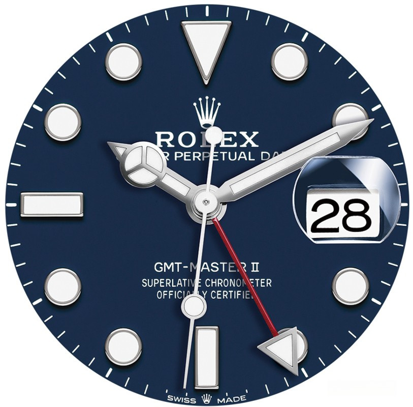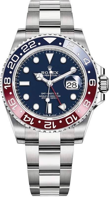 Водостойкие часы Rolex GMT Master II GMT Master II 40mm White Gold с двойным временем (являются официально сертифицированным хронометром COSC) выпущены в круглом корпусе из белого золота 18к. Размер составляет 40 х 12,15 мм, водонепроницаемость 100 м с вращающимся безелем. Внутри корпуса установлен автоматический механизм, Калибр 3185, обеспечивающий запас хода 48 часов. На синем циферблате отображаются часы, минуты, секунды, дата. Часы комплектуются браслетом из белого золота 18к.