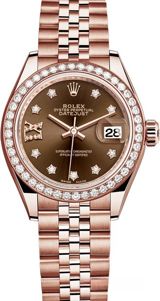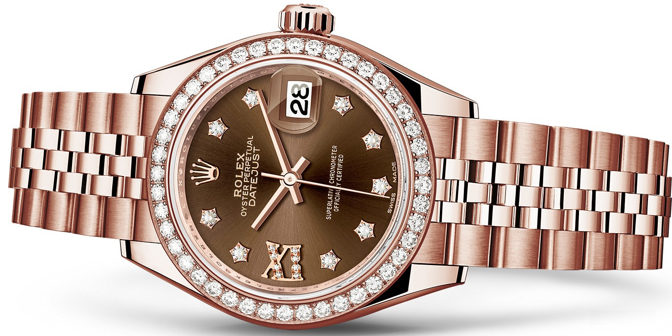 Часы Rolex Lady-Datejust изготовляются из розового золота 18к и отличаются новым циферблатом, который подчеркивает обновленный облик модели. Циферблат коричневый, белые бриллианты, безель из белых бриллиантов. Новые накладки подчеркивают элегантность и женственность этой модели. Модель Lady-Datejust оснащена калибром 2236 – механизмом нового поколения с функцией автоматического подзавода, который полностью разработан и изготовлен Ролексом. Данный механизм включает в себя кремниевую спираль Syloxi, запатентованную Ролексом, которая позволяет ему достигать хронометрической сверхточности, уникальной для женской модели часов. Этот механизм отмечен сертификатом Швейцарского хронометра, который выдан Официальным швейцарским институтом хронометрии (COSC). Часы комплектуются браслетом из розового золота 18к.