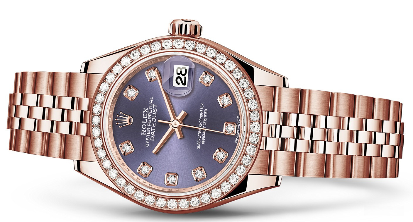 Часы Rolex Lady-Datejust изготовляются из розового золота 18к и отличаются новым циферблатом, который подчеркивает обновленный облик модели. Циферблат синий с 10-ю белыми бриллиантами. Безель из белых бриллиантов. Новые накладки подчеркивают элегантность и женственность этой модели. Модель Lady-Datejust оснащена калибром 2236 – механизмом нового поколения с функцией автоматического подзавода, который полностью разработан и изготовлен Ролексом. Данный механизм включает в себя кремниевую спираль Syloxi, запатентованную Ролексом, которая позволяет ему достигать хронометрической сверхточности, уникальной для женской модели часов. Этот механизм отмечен сертификатом Швейцарского хронометра, который выдан Официальным швейцарским институтом хронометрии (COSC). Часы комплектуются браслетом из розового золота 18к.