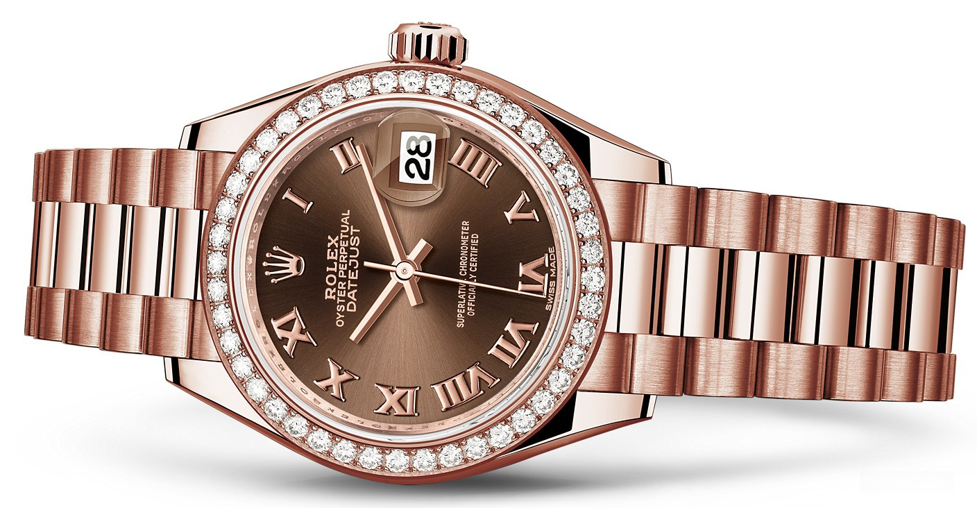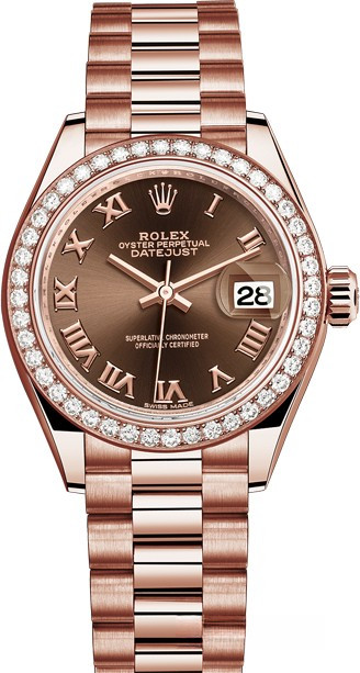 Часы Rolex Lady-Datejust изготовляются из розового золота 18к и отличаются новым циферблатом, который подчеркивает обновленный облик модели. Циферблат коричневый, безель из белых бриллиантов. Новые накладки подчеркивают элегантность и женственность этой модели. Модель Lady-Datejust оснащена калибром 2236 – механизмом нового поколения с функцией автоматического подзавода, который полностью разработан и изготовлен Ролексом. Данный механизм включает в себя кремниевую спираль Syloxi, запатентованную Ролексом, которая позволяет ему достигать хронометрической сверхточности, уникальной для женской модели часов. Этот механизм отмечен сертификатом Швейцарского хронометра, который выдан Официальным швейцарским институтом хронометрии (COSC). Часы комплектуются браслетом из розового золота 18к.