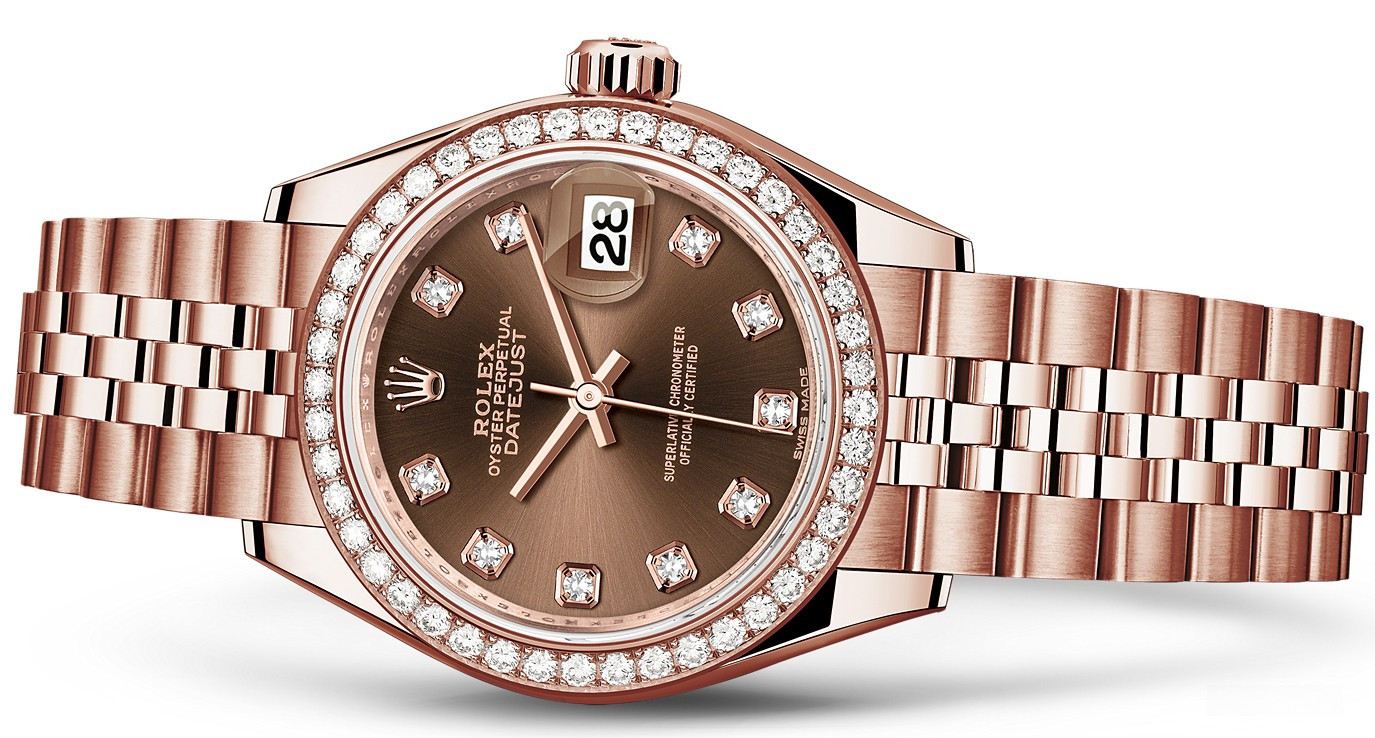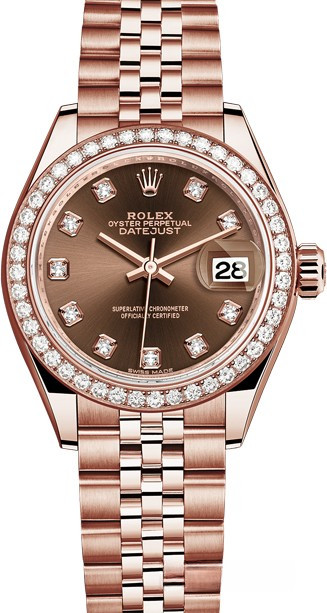 Часы Rolex Lady-Datejust изготовляются из розового золота 18к и отличаются новым циферблатом, который подчеркивает обновленный облик модели. Циферблат коричневый с 10-ю белыми бриллиантами. Безель из белых бриллиантов. Новые накладки подчеркивают элегантность и женственность этой модели. Модель Lady-Datejust оснащена калибром 2236 – механизмом нового поколения с функцией автоматического подзавода, который полностью разработан и изготовлен Ролексом. Данный механизм включает в себя кремниевую спираль Syloxi, запатентованную Ролексом, которая позволяет ему достигать хронометрической сверхточности, уникальной для женской модели часов. Этот механизм отмечен сертификатом Швейцарского хронометра, который выдан Официальным швейцарским институтом хронометрии (COSC). Часы комплектуются браслетом из розового золота 18к.