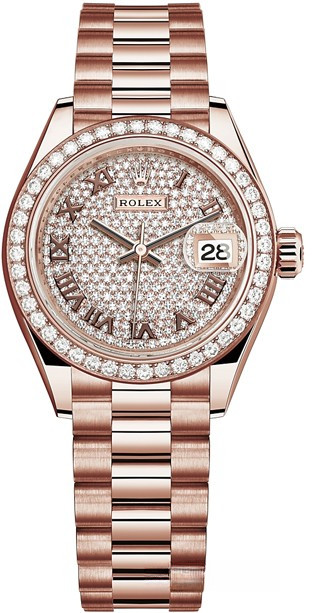 Часы Rolex Lady-Datejust изготовляются из розового золота 18к и отличаются новым циферблатом, который подчеркивает обновленный облик модели. Циферблат из белых бриллиантов. Модель Lady-Datejust оснащена калибром 2236 – механизмом нового поколения с функцией автоматического подзавода, который полностью разработан и изготовлен Ролексом. Данный механизм включает в себя кремниевую спираль Syloxi, запатентованную Ролексом, которая позволяет ему достигать хронометрической сверхточности, уникальной для женской модели часов. Этот механизм отмечен сертификатом Швейцарского хронометра, который выдан Официальным швейцарским институтом хронометрии (COSC). Часы комплектуются браслетом из розового золота 18к.
