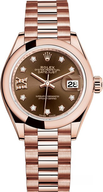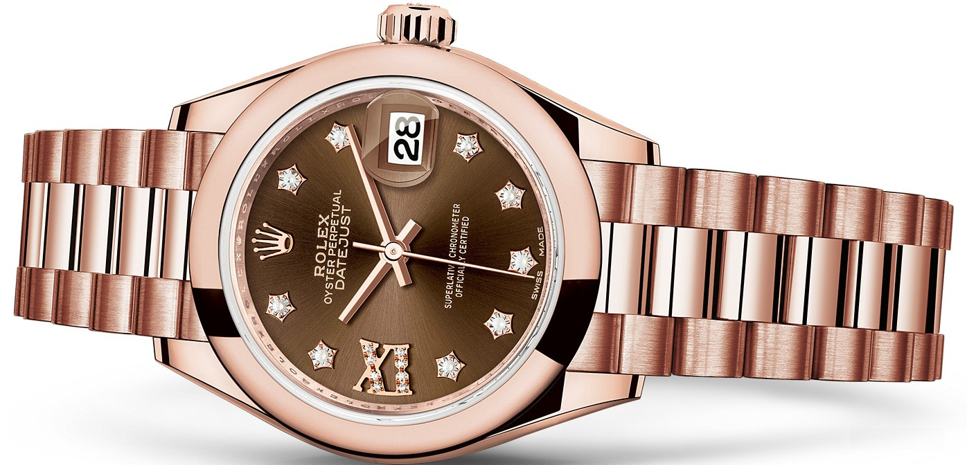 Часы Rolex Lady-Datejust изготовляются из розового золота 18к и отличаются новым циферблатом, который подчеркивает обновленный облик модели. Циферблат коричневый с белыми бриллиантами. Новые накладки подчеркивают элегантность и женственность этой модели. Модель Lady-Datejust оснащена калибром 2236 – механизмом нового поколения с функцией автоматического подзавода, который полностью разработан и изготовлен Ролексом. Данный механизм включает в себя кремниевую спираль Syloxi, запатентованную Ролексом, которая позволяет ему достигать хронометрической сверхточности, уникальной для женской модели часов. Этот механизм отмечен сертификатом Швейцарского хронометра, который выдан Официальным швейцарским институтом хронометрии (COSC). Часы комплектуются браслетом из розового золота 18к.