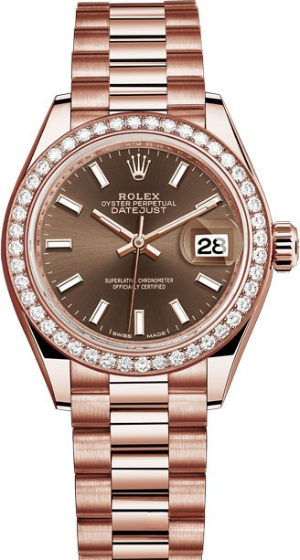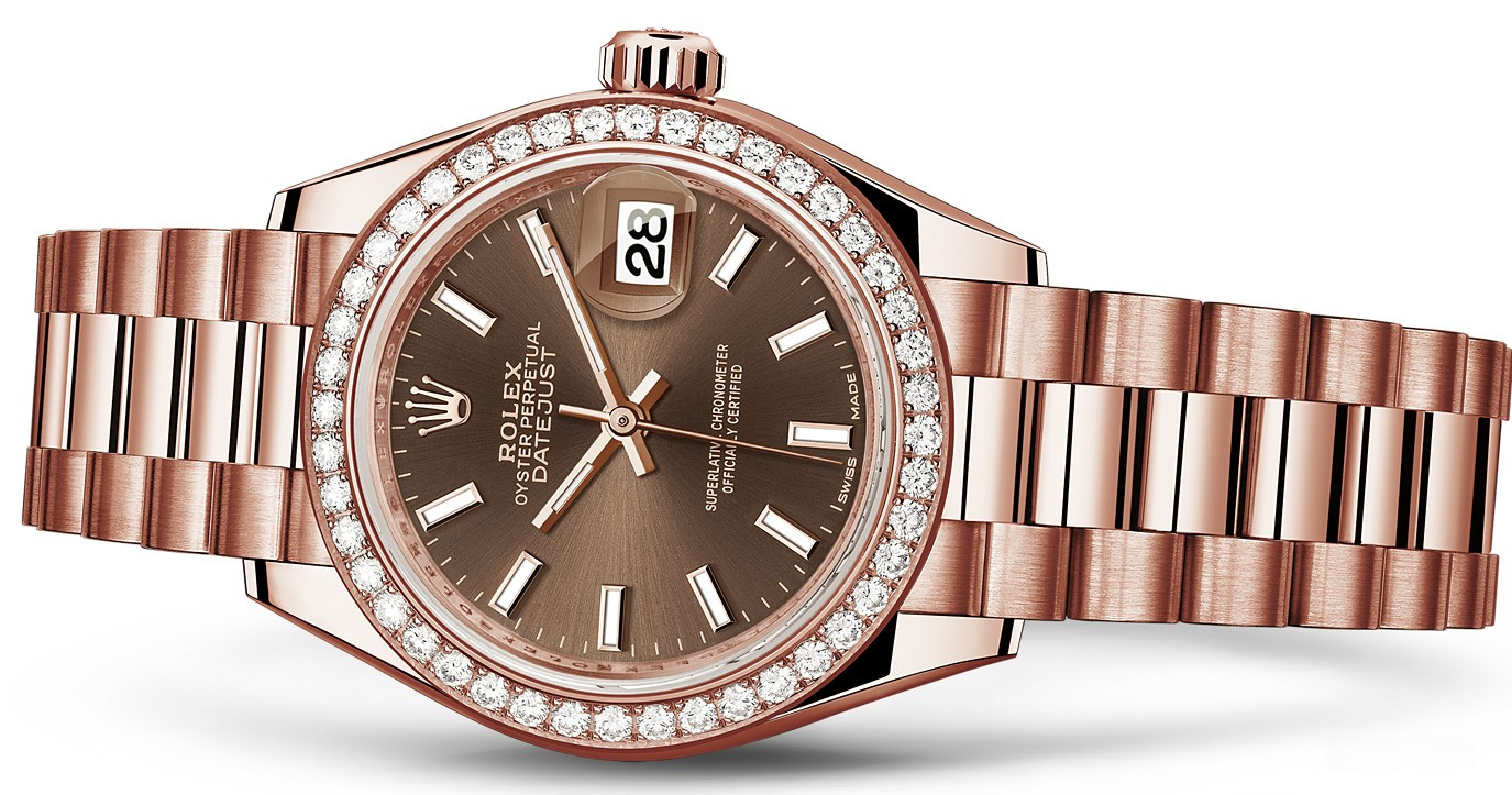 Часы Rolex Lady-Datejust изготовляются из розового золота 18к и отличаются новым циферблатом, который подчеркивает обновленный облик модели. Циферблат коричневый. Новые накладки подчеркивают элегантность и женственность этой модели. Модель Lady-Datejust оснащена калибром 2236 – механизмом нового поколения с функцией автоматического подзавода, который полностью разработан и изготовлен Ролексом. Данный механизм включает в себя кремниевую спираль Syloxi, запатентованную Ролексом, которая позволяет ему достигать хронометрической сверхточности, уникальной для женской модели часов. Этот механизм отмечен сертификатом Швейцарского хронометра, который выдан Официальным швейцарским институтом хронометрии (COSC). Часы комплектуются браслетом из розового золота 18к.