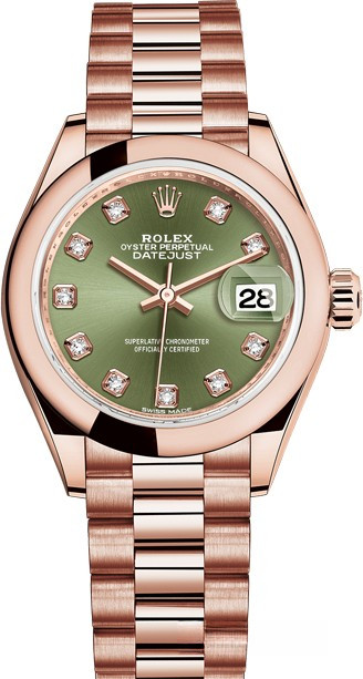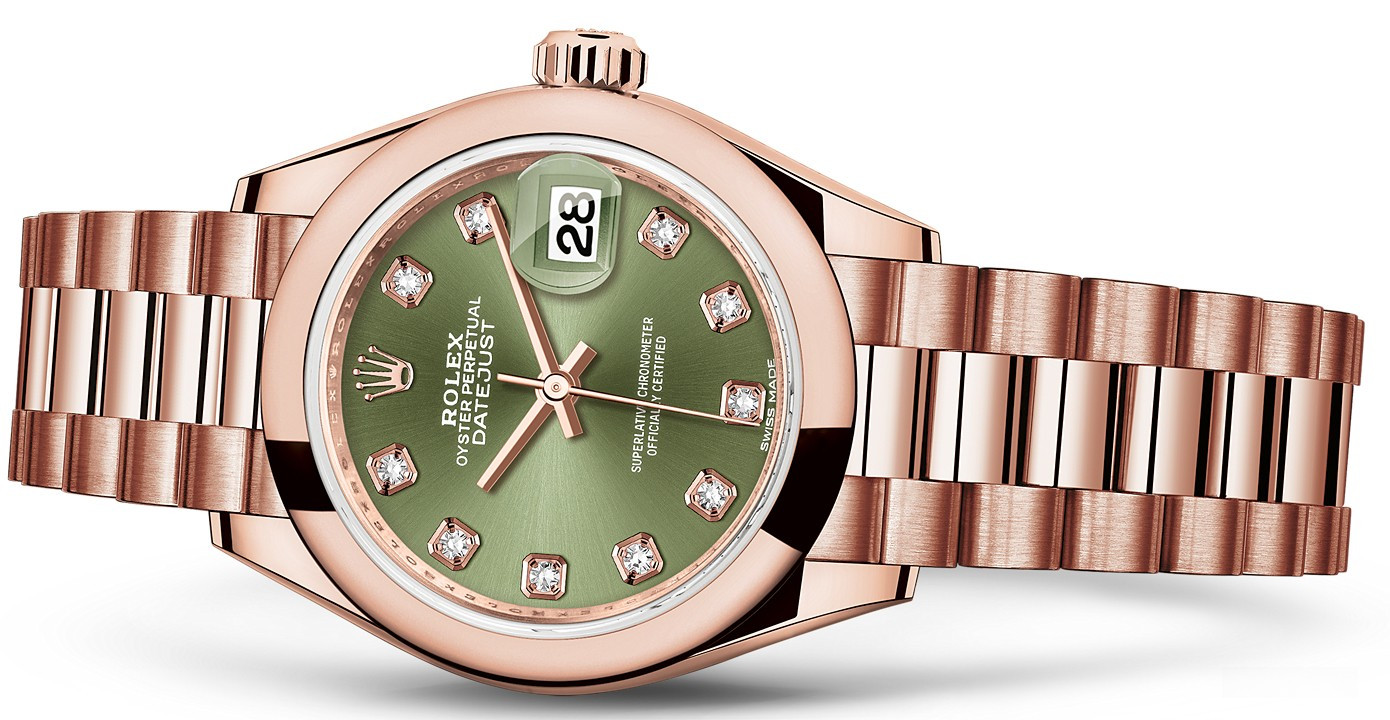 Часы Rolex Lady-Datejust изготовляются из розового золота 18к и отличаются новым циферблатом, который подчеркивает обновленный облик модели. Циферблат зеленый с 10-ю белыми бриллиантами. Новые накладки подчеркивают элегантность и женственность этой модели. Модель Lady-Datejust оснащена калибром 2236 – механизмом нового поколения с функцией автоматического подзавода, который полностью разработан и изготовлен Ролексом. Данный механизм включает в себя кремниевую спираль Syloxi, запатентованную Ролексом, которая позволяет ему достигать хронометрической сверхточности, уникальной для женской модели часов. Этот механизм отмечен сертификатом Швейцарского хронометра, который выдан Официальным швейцарским институтом хронометрии (COSC). Часы комплектуются браслетом из розового золота 18к.
