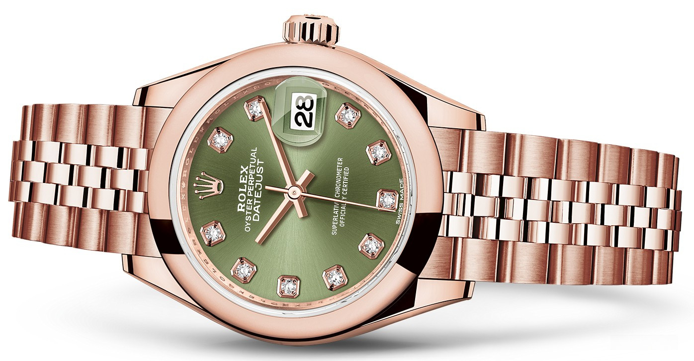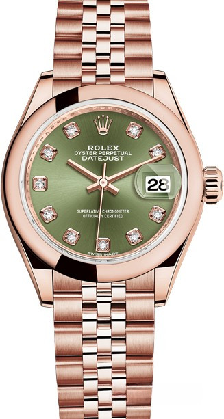 Часы Rolex Lady-Datejust изготовляются из розового золота 18к и отличаются новым циферблатом, который подчеркивает обновленный облик модели. Циферблат зеленый, 10 белых бриллиантов. Новые накладки подчеркивают элегантность и женственность этой модели. Модель Lady-Datejust оснащена калибром 2236 – механизмом нового поколения с функцией автоматического подзавода, который полностью разработан и изготовлен Ролексом. Данный механизм включает в себя кремниевую спираль Syloxi, запатентованную Ролексом, которая позволяет ему достигать хронометрической сверхточности, уникальной для женской модели часов. Этот механизм отмечен сертификатом Швейцарского хронометра, который выдан Официальным швейцарским институтом хронометрии (COSC). Часы комплектуются браслетом из розового золота 18к.