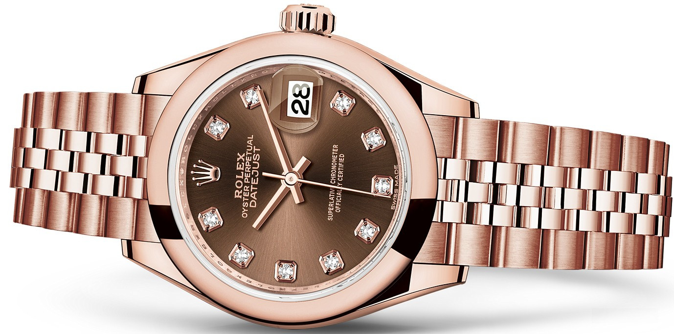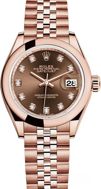 Часы Rolex Lady-Datejust изготовляются из розового золота 18к и отличаются новым циферблатом, который подчеркивает обновленный облик модели. Циферблат коричневый, 10 белых бриллиантов. Новые накладки подчеркивают элегантность и женственность этой модели. Модель Lady-Datejust оснащена калибром 2236 – механизмом нового поколения с функцией автоматического подзавода, который полностью разработан и изготовлен Ролексом. Данный механизм включает в себя кремниевую спираль Syloxi, запатентованную Ролексом, которая позволяет ему достигать хронометрической сверхточности, уникальной для женской модели часов. Этот механизм отмечен сертификатом Швейцарского хронометра, который выдан Официальным швейцарским институтом хронометрии (COSC). Часы комплектуются браслетом из розового золота 18к.