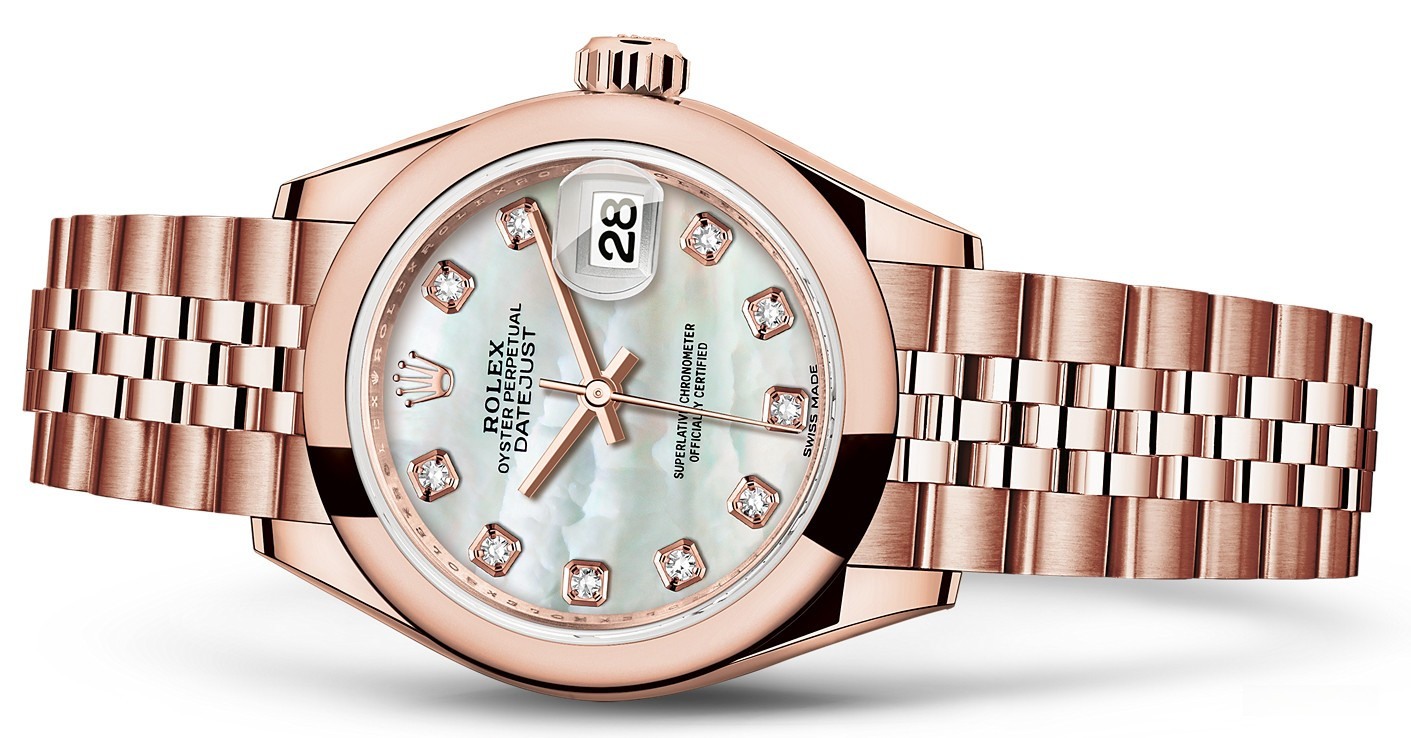 Часы Rolex Lady-Datejust изготовляются из розового золота 18к и отличаются новым циферблатом, который подчеркивает обновленный облик модели. Циферблат белый жемчужный с 10-ю белыми бриллиантами. Новые накладки подчеркивают элегантность и женственность этой модели. Модель Lady-Datejust оснащена калибром 2236 – механизмом нового поколения с функцией автоматического подзавода, который полностью разработан и изготовлен Ролексом. Данный механизм включает в себя кремниевую спираль Syloxi, запатентованную Ролексом, которая позволяет ему достигать хронометрической сверхточности, уникальной для женской модели часов. Этот механизм отмечен сертификатом Швейцарского хронометра, который выдан Официальным швейцарским институтом хронометрии (COSC). Часы комплектуются браслетом из розового золота 18к.