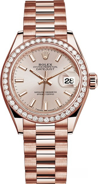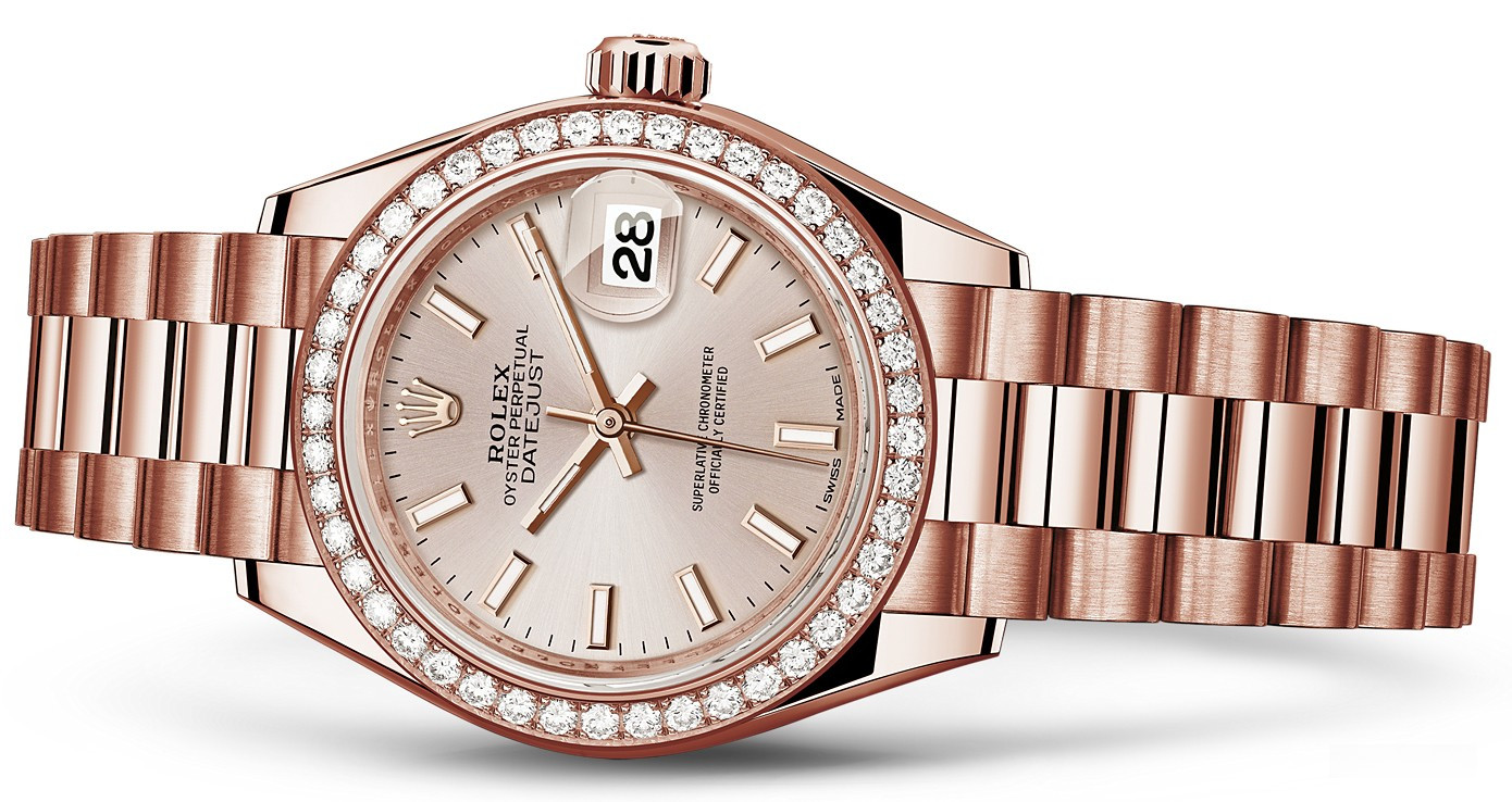 Часы Rolex Lady-Datejust изготовляются из розового золота 18к и отличаются новым циферблатом, который подчеркивает обновленный облик модели. Циферблат золотистый. Безель из белых бриллиантов. Новые накладки подчеркивают элегантность и женственность этой модели. Модель Lady-Datejust оснащена калибром 2236 – механизмом нового поколения с функцией автоматического подзавода, который полностью разработан и изготовлен Ролексом. Данный механизм включает в себя кремниевую спираль Syloxi, запатентованную Ролексом, которая позволяет ему достигать хронометрической сверхточности, уникальной для женской модели часов. Этот механизм отмечен сертификатом Швейцарского хронометра, который выдан Официальным швейцарским институтом хронометрии (COSC). Часы комплектуются браслетом из розового золота 18к.