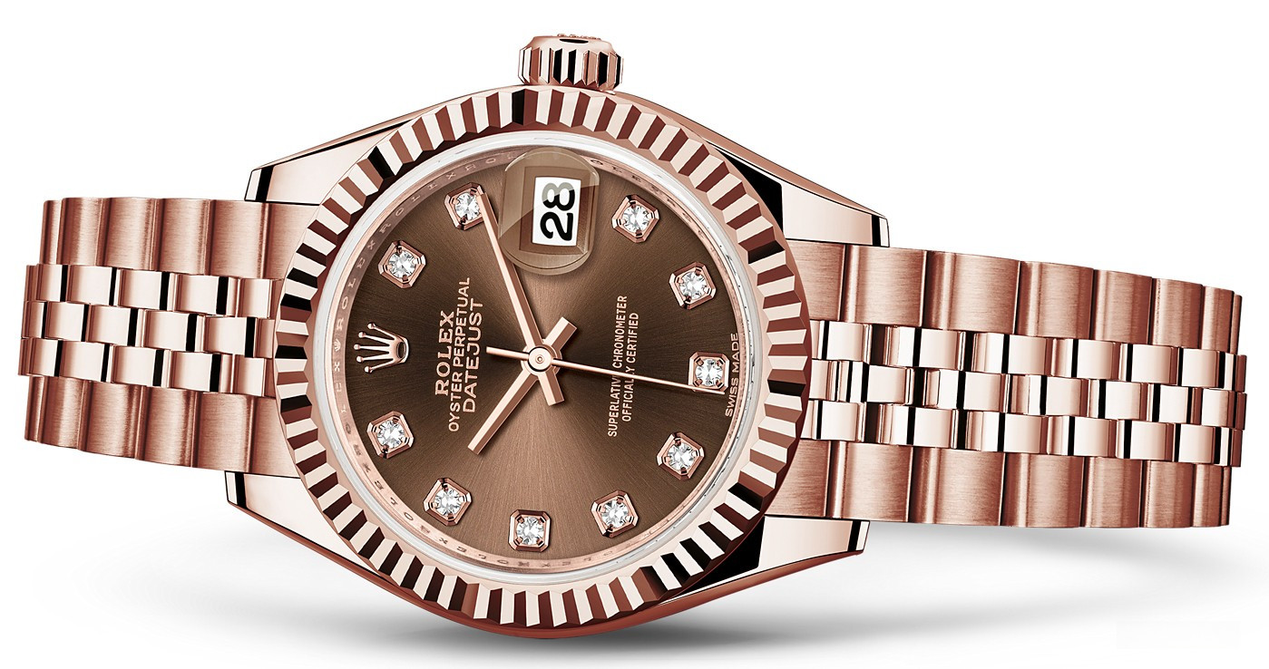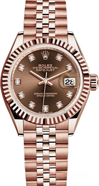Часы Rolex Lady-Datejust изготовляются из розового золота 18к и отличаются новым циферблатом, который подчеркивает обновленный облик модели. Циферблат коричневый, 10 белых бриллиантов. Новые накладки подчеркивают элегантность и женственность этой модели. Модель Lady-Datejust оснащена калибром 2236 – механизмом нового поколения с функцией автоматического подзавода, который полностью разработан и изготовлен Ролексом. Данный механизм включает в себя кремниевую спираль Syloxi, запатентованную Ролексом, которая позволяет ему достигать хронометрической сверхточности, уникальной для женской модели часов. Этот механизм отмечен сертификатом Швейцарского хронометра, который выдан Официальным швейцарским институтом хронометрии (COSC). Часы комплектуются браслетом из розового золота 18к.