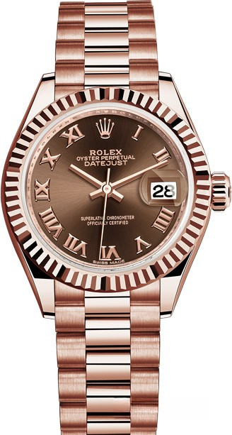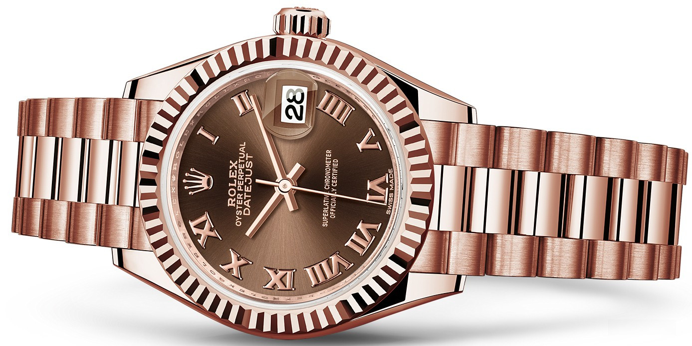 Часы Rolex Lady-Datejust изготовляются из розового золота 18к и отличаются новым циферблатом, который подчеркивает обновленный облик модели. Циферблат коричневый. Новые накладки подчеркивают элегантность и женственность этой модели. Модель Lady-Datejust оснащена калибром 2236 – механизмом нового поколения с функцией автоматического подзавода, который полностью разработан и изготовлен Ролексом. Данный механизм включает в себя кремниевую спираль Syloxi, запатентованную Ролексом, которая позволяет ему достигать хронометрической сверхточности, уникальной для женской модели часов. Этот механизм отмечен сертификатом Швейцарского хронометра, который выдан Официальным швейцарским институтом хронометрии (COSC). Часы комплектуются браслетом из розового золота 18к.