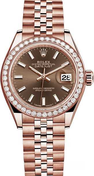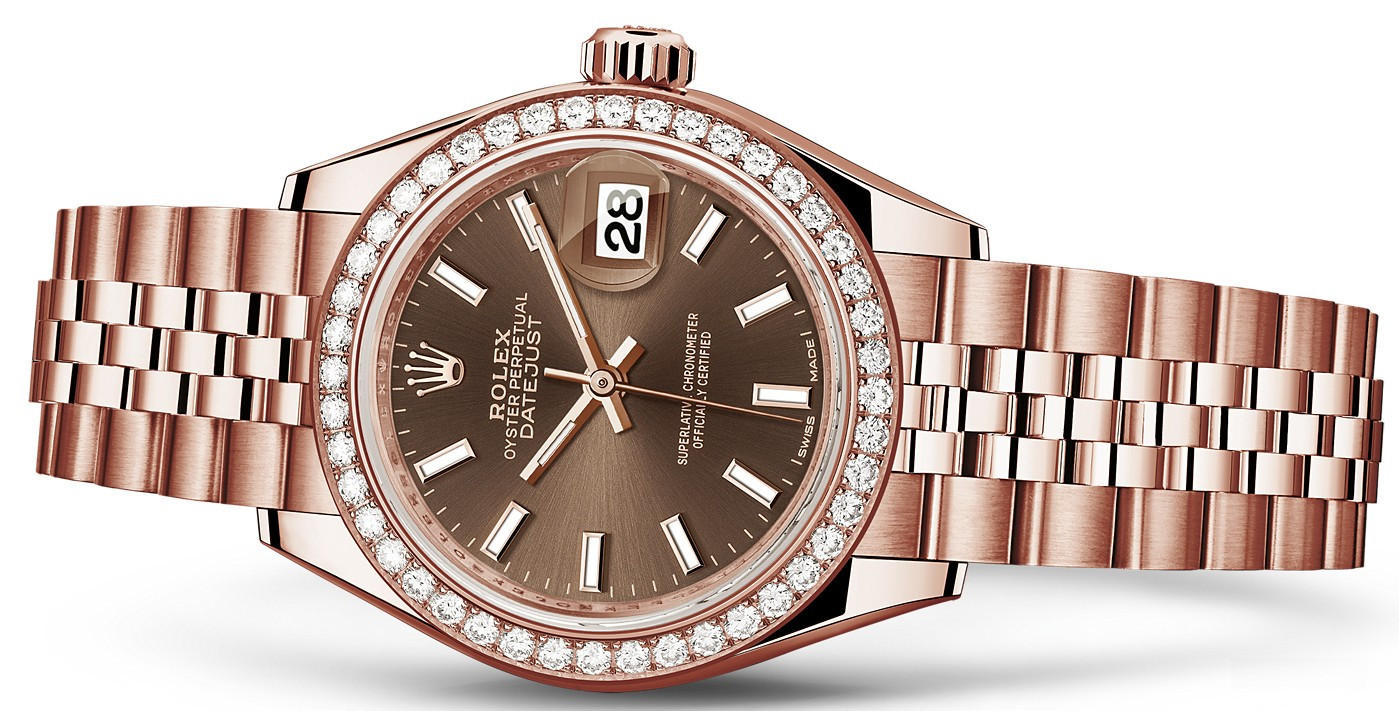 Часы Rolex Lady-Datejust изготовляются из розового золота 18к и отличаются новым циферблатом, который подчеркивает обновленный облик модели. Циферблат коричневый, безель из белых бриллиантов. Новые накладки подчеркивают элегантность и женственность этой модели. Модель Lady-Datejust оснащена калибром 2236 – механизмом нового поколения с функцией автоматического подзавода, который полностью разработан и изготовлен Ролексом. Данный механизм включает в себя кремниевую спираль Syloxi, запатентованную Ролексом, которая позволяет ему достигать хронометрической сверхточности, уникальной для женской модели часов. Этот механизм отмечен сертификатом Швейцарского хронометра, который выдан Официальным швейцарским институтом хронометрии (COSC). Часы комплектуются браслетом из розового золота 18к.