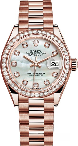 Часы Rolex Lady-Datejust изготовляются из розового золота 18к и отличаются новым циферблатом, который подчеркивает обновленный облик модели. Циферблат белый жемчужный с 10-ю белыми бриллиантами. Безель из белых бриллиантов. Новые накладки подчеркивают элегантность и женственность этой модели. Модель Lady-Datejust оснащена калибром 2236 – механизмом нового поколения с функцией автоматического подзавода, который полностью разработан и изготовлен Ролексом. Данный механизм включает в себя кремниевую спираль Syloxi, запатентованную Ролексом, которая позволяет ему достигать хронометрической сверхточности, уникальной для женской модели часов. Этот механизм отмечен сертификатом Швейцарского хронометра, который выдан Официальным швейцарским институтом хронометрии (COSC). Часы комплектуются браслетом из розового золота 18к.