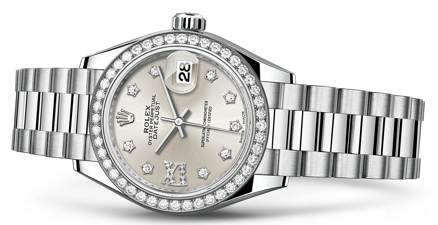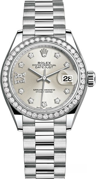 Часы Rolex Lady-Datejust изготовляются из платины и отличаются новым циферблатом, который подчеркивает обновленный облик модели. Благодаря применению технологии двойной отделки, в которой сочетается нанесение рисунка и отделка циферблата с солнечным переливом, циферблат отличается уникальной цветопередачей. Новые накладки подчеркивают элегантность и женственность этой модели. Модель Lady-Datejust оснащена калибром 2236 – механизмом нового поколения с функцией автоматического подзавода, который полностью разработан и изготовлен Ролексом. Данный механизм включает в себя кремниевую спираль Syloxi, запатентованную Ролексом, которая позволяет ему достигать хронометрической сверхточности, уникальной для женской модели часов. Этот механизм отмечен сертификатом Швейцарского хронометра, который выдан Официальным швейцарским институтом хронометрии (COSC). Часы комплектуются браслетом из платины 950.