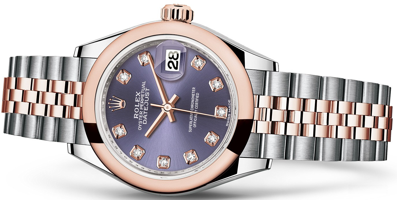 Часы Rolex Lady-Datejust изготовляются из нержавеющей стали и розового золота 18к и отличаются новым циферблатом, который подчеркивает обновленный облик модели. Циферблат синий с 10-ю белыми бриллиантами. Модель Lady-Datejust оснащена калибром 2236 – механизмом нового поколения с функцией автоматического подзавода, который полностью разработан и изготовлен Ролексом. Данный механизм включает в себя кремниевую спираль Syloxi, запатентованную Ролексом, которая позволяет ему достигать хронометрической сверхточности, уникальной для женской модели часов. Этот механизм отмечен сертификатом Швейцарского хронометра, который выдан Официальным швейцарским институтом хронометрии (COSC). Часы комплектуются браслетом из нержавеющей стали и розового золота 18к.
