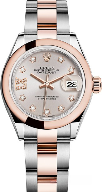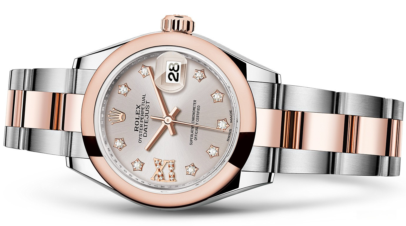 Часы Rolex Lady-Datejust изготовляются из нержавеющей стали и розового золота 18к и отличаются новым циферблатом, который подчеркивает обновленный облик модели. Циферблат серебристый с белыми бриллиантами. Модель Lady-Datejust оснащена калибром 2236 – механизмом нового поколения с функцией автоматического подзавода, который полностью разработан и изготовлен Ролексом. Данный механизм включает в себя кремниевую спираль Syloxi, запатентованную Ролексом, которая позволяет ему достигать хронометрической сверхточности, уникальной для женской модели часов. Этот механизм отмечен сертификатом Швейцарского хронометра, который выдан Официальным швейцарским институтом хронометрии (COSC). Часы комплектуются браслетом из нержавеющей стали и розового золота 18к.