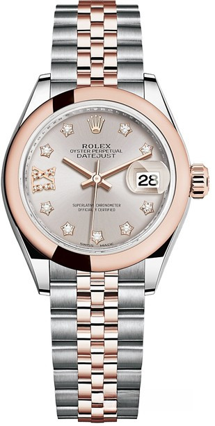 Часы Rolex Lady-Datejust изготовляются из нержавеющей стали и розового золота 18к и отличаются новым циферблатом, который подчеркивает обновленный облик модели. Циферблат серебристый с белыми бриллиантами. Модель Lady-Datejust оснащена калибром 2236 – механизмом нового поколения с функцией автоматического подзавода, который полностью разработан и изготовлен Ролексом. Данный механизм включает в себя кремниевую спираль Syloxi, запатентованную Ролексом, которая позволяет ему достигать хронометрической сверхточности, уникальной для женской модели часов. Этот механизм отмечен сертификатом Швейцарского хронометра, который выдан Официальным швейцарским институтом хронометрии (COSC). Часы комплектуются браслетом из нержавеющей стали и розового золота 18к.