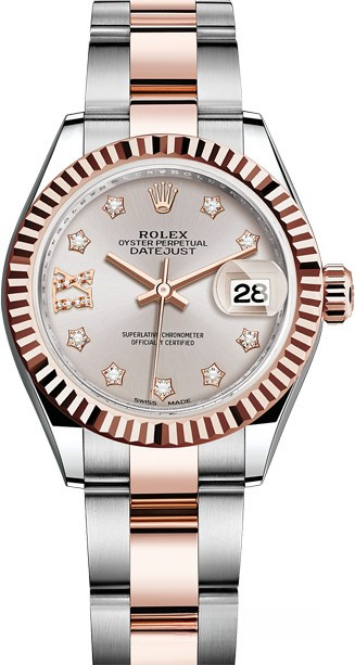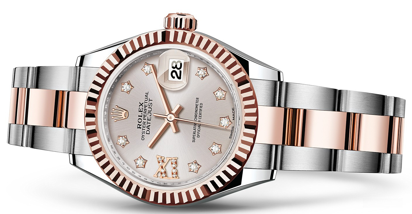 Часы Rolex Lady-Datejust изготовляются из нержавеющей стали и розового золота 18к и отличаются новым циферблатом, который подчеркивает обновленный облик модели. Циферблат серебристый, белые бриллианты. Модель Lady-Datejust оснащена калибром 2236 – механизмом нового поколения с функцией автоматического подзавода, который полностью разработан и изготовлен Ролексом. Данный механизм включает в себя кремниевую спираль Syloxi, запатентованную Ролексом, которая позволяет ему достигать хронометрической сверхточности, уникальной для женской модели часов. Этот механизм отмечен сертификатом Швейцарского хронометра, который выдан Официальным швейцарским институтом хронометрии (COSC). Часы комплектуются браслетом из нержавеющей стали и розового золота 18к.
