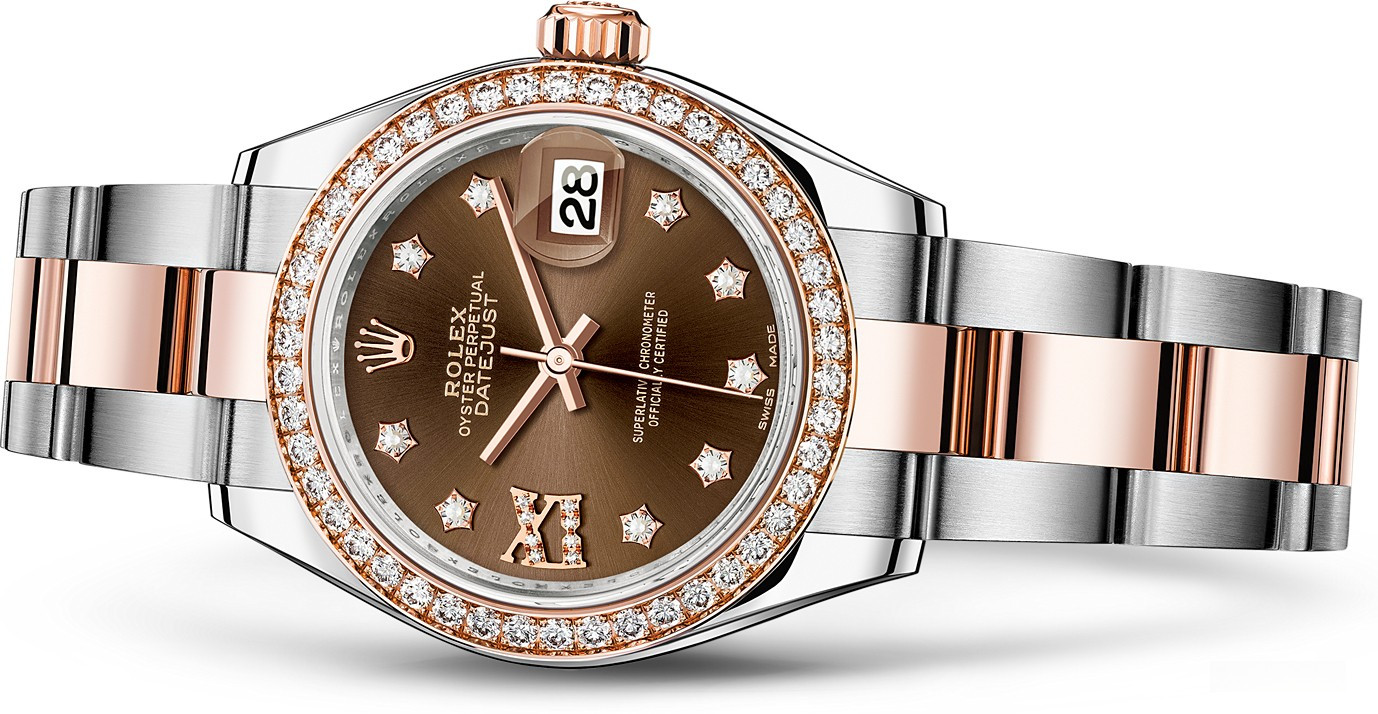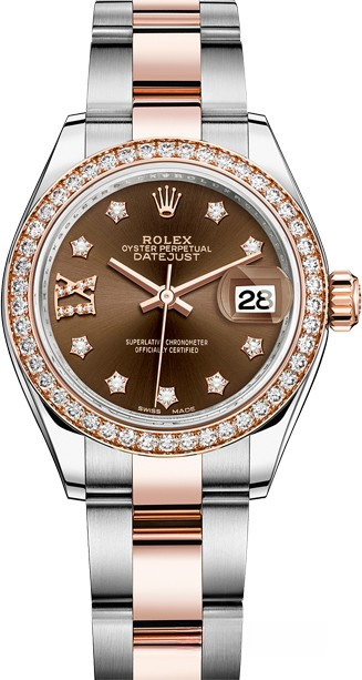 Часы Rolex Lady-Datejust изготовляются из нержавеющей стали и розового золота 18к и отличаются новым циферблатом, который подчеркивает обновленный облик модели. Циферблат коричневый с белыми бриллиантами. Безель из белых бриллиантов. Модель Lady-Datejust оснащена калибром 2236 – механизмом нового поколения с функцией автоматического подзавода, который полностью разработан и изготовлен Ролексом. Данный механизм включает в себя кремниевую спираль Syloxi, запатентованную Ролексом, которая позволяет ему достигать хронометрической сверхточности, уникальной для женской модели часов. Этот механизм отмечен сертификатом Швейцарского хронометра, который выдан Официальным швейцарским институтом хронометрии (COSC). Часы комплектуются браслетом из нержавеющей стали и розового золота 18к.