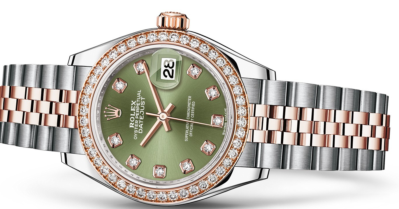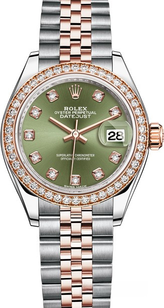 Часы Rolex Lady-Datejust изготовляются из нержавеющей стали и розового золота 18к и отличаются новым циферблатом, который подчеркивает обновленный облик модели. Циферблат зеленый с 10-ю белыми бриллиантами. Безель из белых бриллиантов. Модель Lady-Datejust оснащена калибром 2236 – механизмом нового поколения с функцией автоматического подзавода, который полностью разработан и изготовлен Ролексом. Данный механизм включает в себя кремниевую спираль Syloxi, запатентованную Ролексом, которая позволяет ему достигать хронометрической сверхточности, уникальной для женской модели часов. Этот механизм отмечен сертификатом Швейцарского хронометра, который выдан Официальным швейцарским институтом хронометрии (COSC). Часы комплектуются браслетом из нержавеющей стали и розового золота 18к.