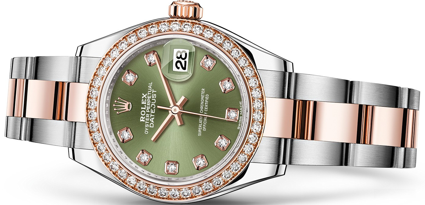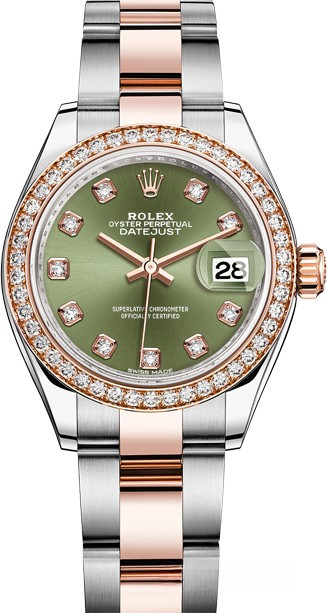 Часы Rolex Lady-Datejust изготовляются из нержавеющей стали и розового золота 18к и отличаются новым циферблатом, который подчеркивает обновленный облик модели. Циферблат зеленый с 10-ю белыми бриллиантами. Безель из белых бриллиантов. Модель Lady-Datejust оснащена калибром 2236 – механизмом нового поколения с функцией автоматического подзавода, который полностью разработан и изготовлен Ролексом. Данный механизм включает в себя кремниевую спираль Syloxi, запатентованную Ролексом, которая позволяет ему достигать хронометрической сверхточности, уникальной для женской модели часов. Этот механизм отмечен сертификатом Швейцарского хронометра, который выдан Официальным швейцарским институтом хронометрии (COSC). Часы комплектуются браслетом из нержавеющей стали и розового золота 18к.