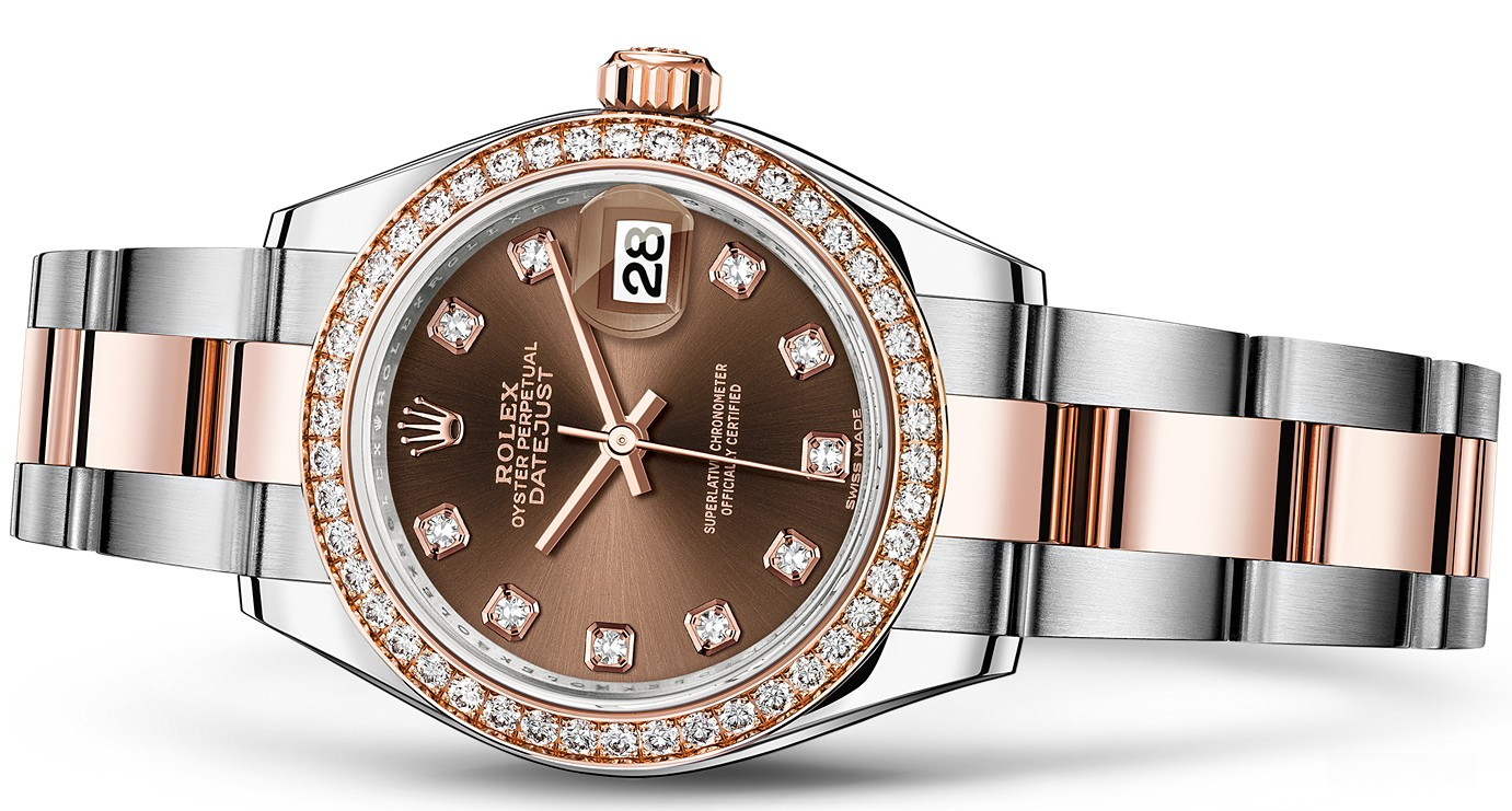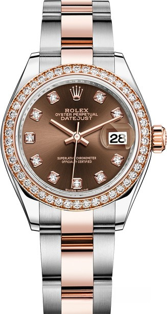 Часы Rolex Lady-Datejust изготовляются из нержавеющей стали и розового золота 18к и отличаются новым циферблатом, который подчеркивает обновленный облик модели. Циферблат коричневый с 10-ю белыми бриллиантами. Безель из белых бриллиантов. Модель Lady-Datejust оснащена калибром 2236 – механизмом нового поколения с функцией автоматического подзавода, который полностью разработан и изготовлен Ролексом. Данный механизм включает в себя кремниевую спираль Syloxi, запатентованную Ролексом, которая позволяет ему достигать хронометрической сверхточности, уникальной для женской модели часов. Этот механизм отмечен сертификатом Швейцарского хронометра, который выдан Официальным швейцарским институтом хронометрии (COSC). Часы комплектуются браслетом из нержавеющей стали и розового золота 18к.
