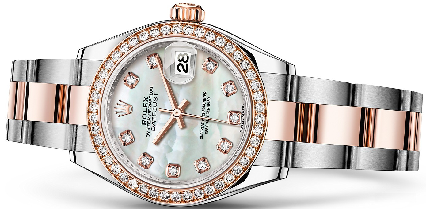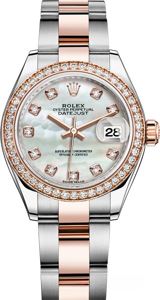 Часы Rolex Lady-Datejust изготовляются из нержавеющей стали и розового золота 18к и отличаются новым циферблатом, который подчеркивает обновленный облик модели. Циферблат белый жемчужный с 10-ю белыми бриллиантами. Безель из белых бриллиантов. Модель Lady-Datejust оснащена калибром 2236 – механизмом нового поколения с функцией автоматического подзавода, который полностью разработан и изготовлен Ролексом. Данный механизм включает в себя кремниевую спираль Syloxi, запатентованную Ролексом, которая позволяет ему достигать хронометрической сверхточности, уникальной для женской модели часов. Этот механизм отмечен сертификатом Швейцарского хронометра, который выдан Официальным швейцарским институтом хронометрии (COSC). Часы комплектуются браслетом из нержавеющей стали и розового золота 18к.