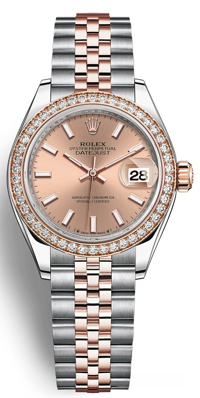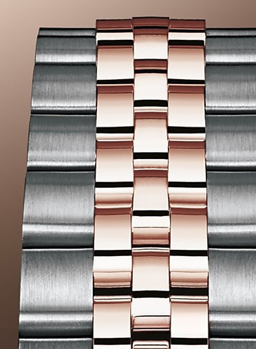 Часы Rolex Lady-Datejust изготовляются из нержавеющей стали и розового золота 18к и отличаются новым циферблатом, который подчеркивает обновленный облик модели. Циферблат золотистый. Модель Lady-Datejust оснащена калибром 2236 – механизмом нового поколения с функцией автоматического подзавода, который полностью разработан и изготовлен Ролексом. Данный механизм включает в себя кремниевую спираль Syloxi, запатентованную Ролексом, которая позволяет ему достигать хронометрической сверхточности, уникальной для женской модели часов. Этот механизм отмечен сертификатом Швейцарского хронометра, который выдан Официальным швейцарским институтом хронометрии (COSC). Часы комплектуются браслетом из нержавеющей стали и розового золота 18к. Безель из белых бриллиантов.