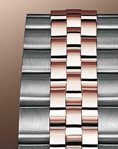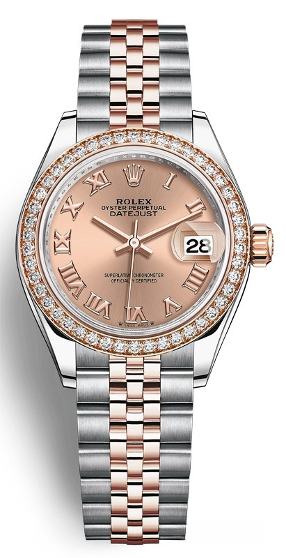Часы Rolex Lady-Datejust изготовляются из нержавеющей стали и розового золота 18к и отличаются новым циферблатом, который подчеркивает обновленный облик модели. Циферблат золотистый. Модель Lady-Datejust оснащена калибром 2236 – механизмом нового поколения с функцией автоматического подзавода, который полностью разработан и изготовлен Ролексом. Данный механизм включает в себя кремниевую спираль Syloxi, запатентованную Ролексом, которая позволяет ему достигать хронометрической сверхточности, уникальной для женской модели часов. Этот механизм отмечен сертификатом Швейцарского хронометра, который выдан Официальным швейцарским институтом хронометрии (COSC). Часы комплектуются браслетом из нержавеющей стали и розового золота 18к. Безель из белых бриллиантов.