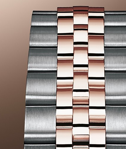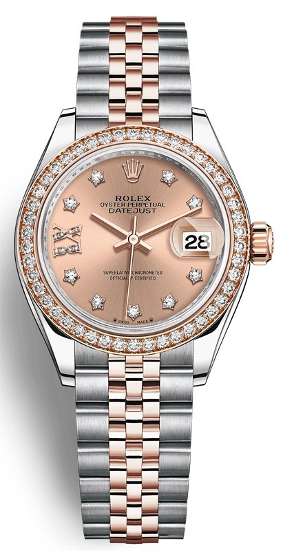 Часы Rolex Lady-Datejust изготовляются из нержавеющей стали и розового золота 18к и отличаются новым циферблатом, который подчеркивает обновленный облик модели. Циферблат золотистый с белыми бриллиантами. Модель Lady-Datejust оснащена калибром 2236 – механизмом нового поколения с функцией автоматического подзавода, который полностью разработан и изготовлен Ролексом. Данный механизм включает в себя кремниевую спираль Syloxi, запатентованную Ролексом, которая позволяет ему достигать хронометрической сверхточности, уникальной для женской модели часов. Этот механизм отмечен сертификатом Швейцарского хронометра, который выдан Официальным швейцарским институтом хронометрии (COSC). Часы комплектуются браслетом из нержавеющей стали и розового золота 18к. Безель из белых бриллиантов.