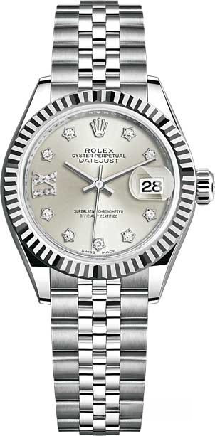 Часы Rolex Lady-Datejust изготовляются из нержавеющей стали и белого золота 18к и отличаются новым циферблатом, который подчеркивает обновленный облик модели. Циферблат серебристый с белыми бриллиантами. Модель Lady-Datejust оснащена калибром 2236 – механизмом нового поколения с функцией автоматического подзавода, который полностью разработан и изготовлен Ролексом. Данный механизм включает в себя кремниевую спираль Syloxi, запатентованную Ролексом, которая позволяет ему достигать хронометрической сверхточности, уникальной для женской модели часов. Этот механизм отмечен сертификатом Швейцарского хронометра, который выдан Официальным швейцарским институтом хронометрии (COSC). Часы комплектуются браслетом из нержавеющей стали.