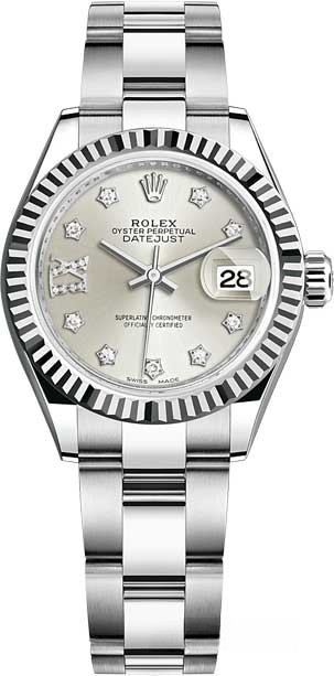 Часы Rolex Lady-Datejust изготовляются из нержавеющей стали и белого золота 18к и отличаются новым циферблатом, который подчеркивает обновленный облик модели. Циферблат серебристый с белыми бриллиантами. Модель Lady-Datejust оснащена калибром 2236 – механизмом нового поколения с функцией автоматического подзавода, который полностью разработан и изготовлен Ролексом. Данный механизм включает в себя кремниевую спираль Syloxi, запатентованную Ролексом, которая позволяет ему достигать хронометрической сверхточности, уникальной для женской модели часов. Этот механизм отмечен сертификатом Швейцарского хронометра, который выдан Официальным швейцарским институтом хронометрии (COSC). Часы комплектуются браслетом из нержавеющей стали.