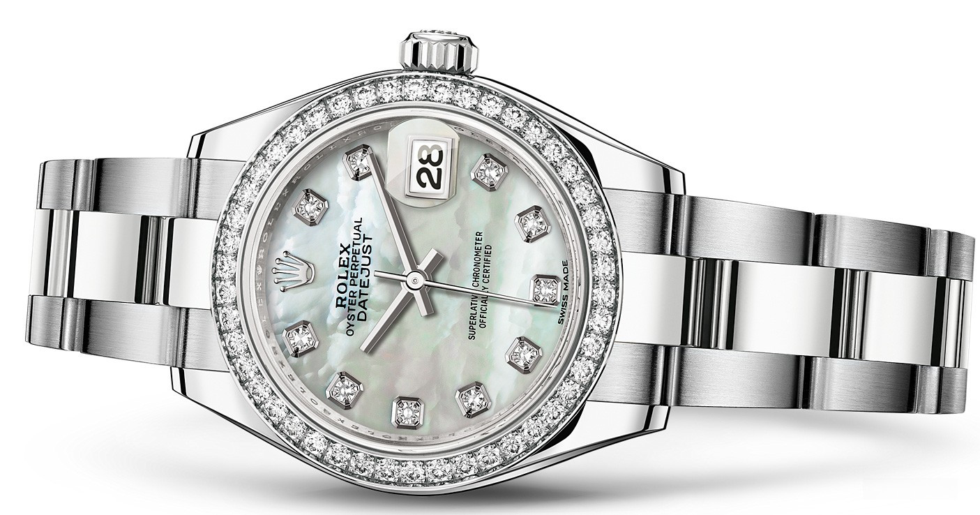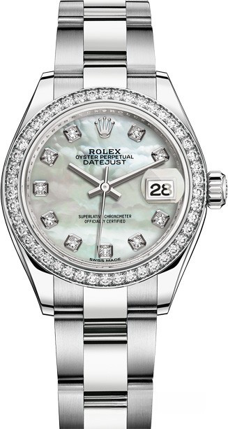Часы Rolex Lady-Datejust изготовляются из нержавеющей стали и белого золота 18к и отличаются новым циферблатом, который подчеркивает обновленный облик модели. Циферблат белый жемчужный с 10-ю белыми бриллиантами. Модель Lady-Datejust оснащена калибром 2236 – механизмом нового поколения с функцией автоматического подзавода, который полностью разработан и изготовлен Ролексом. Данный механизм включает в себя кремниевую спираль Syloxi, запатентованную Ролексом, которая позволяет ему достигать хронометрической сверхточности, уникальной для женской модели часов. Этот механизм отмечен сертификатом Швейцарского хронометра, который выдан Официальным швейцарским институтом хронометрии (COSC). Часы комплектуются браслетом из нержавеющей стали. Безель из белых бриллиантов.