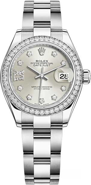 Часы Rolex Lady-Datejust изготовляются из нержавеющей стали и белого золота 18к и отличаются новым циферблатом, который подчеркивает обновленный облик модели. Циферблат серебристый с белыми бриллиантами. Модель Lady-Datejust оснащена калибром 2236 – механизмом нового поколения с функцией автоматического подзавода, который полностью разработан и изготовлен Ролексом. Данный механизм включает в себя кремниевую спираль Syloxi, запатентованную Ролексом, которая позволяет ему достигать хронометрической сверхточности, уникальной для женской модели часов. Этот механизм отмечен сертификатом Швейцарского хронометра, который выдан Официальным швейцарским институтом хронометрии (COSC). Часы комплектуются браслетом из нержавеющей стали. Безель из белых бриллиантов.